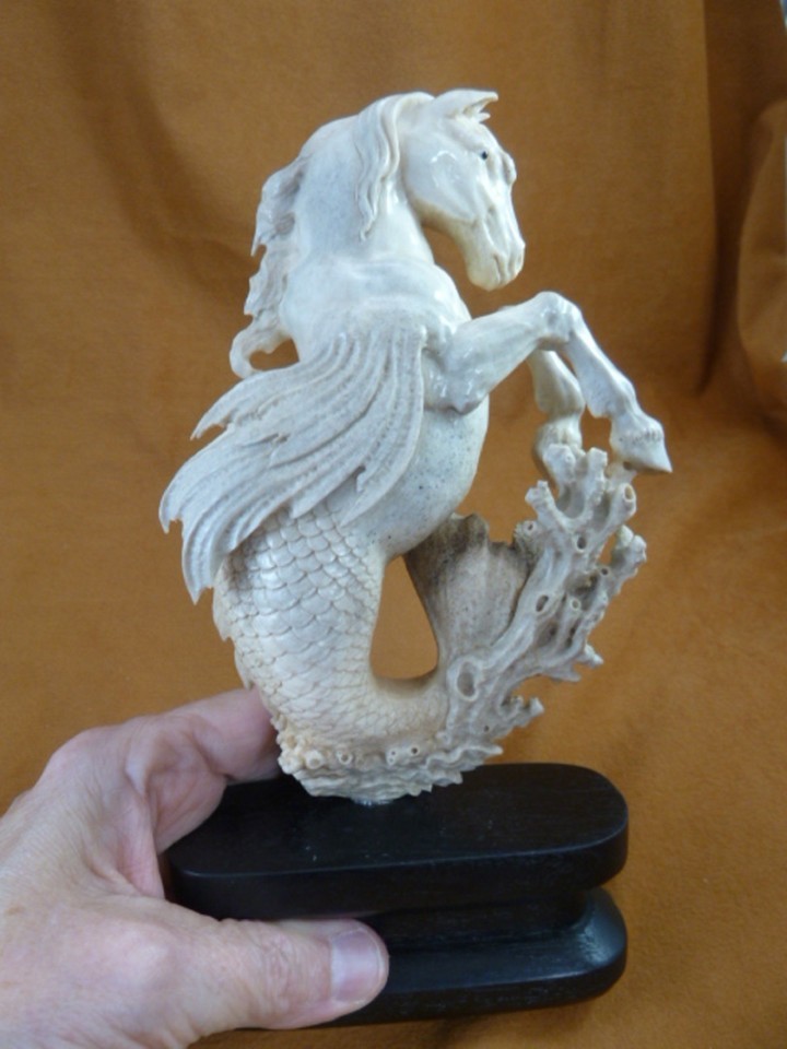 PEGASUS HORSE top with MERMAID TAIL on bottom half, on ocean wave, shed moose antler, fully worked, on wood base
