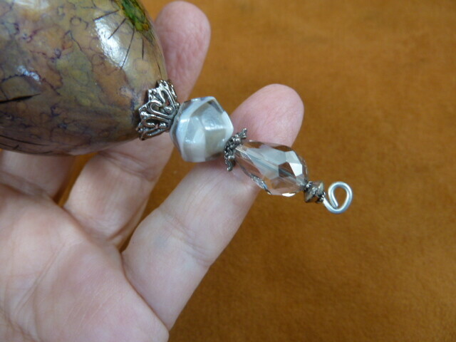 Crystal faceted bead, striped glass bead and silver filigree bead accents above and below; curly silver wire loop, silver wire stand on oak base (made by Bruce);