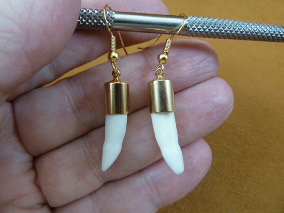(internal #G190-35) Excellent specimens of genuine, modern alligator t**th earrings. T**th are 1-1/16" long with gold plated caps on gold tone hypoallergenic French wires. Gators have three sets of t**th that fit inside each other, like Tupperware, that's why they're hollow.