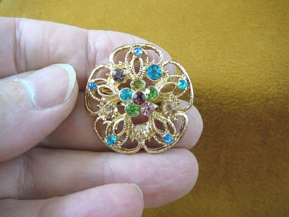 (Internal #BB601-55) This is a beautiful gold (alloy) tone, ornate filigree flower floral design pin with multi-colored rainbow with pink, green, blue, and purple rhinestone crystal accents, average 1-1/4 to 1-1/2" diameter. Hook style pin on back, see photo.