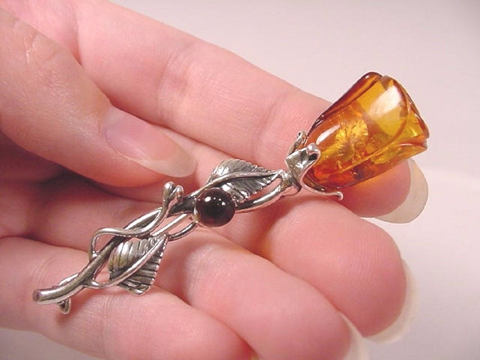 (Internal #P-735) You are bidding on this natural, genuine, AMBER ROSE with bud PIN handmade of TWO pieces of Baltic GOLDEN ORANGE amber into this beautiful pin from Poland, mined on the shores of the Baltic Sea; set in .925 sterling silver as a pin with beautiful details in the leaves and stem, 2-1/2" long. This is the exact item you would receive.