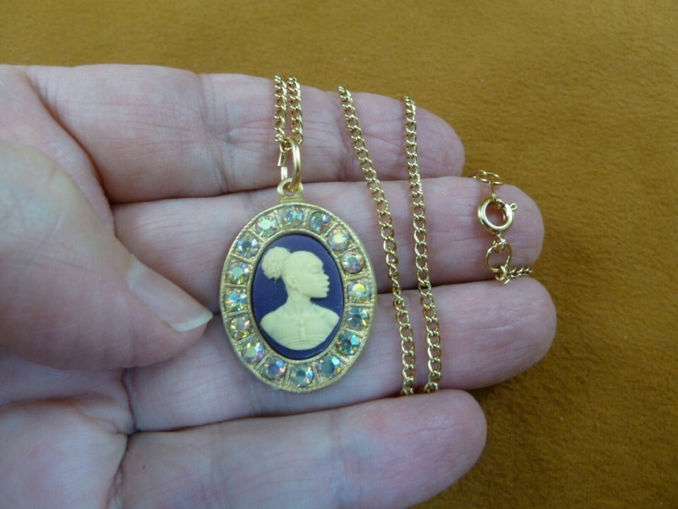 CA30-137) RARE African American LADY purple + white CAMEO brass pendant necklace