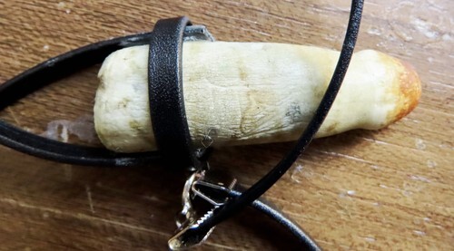 (Internal #G-162-204A) You are bidding on a necklace made with Two gator t**th (1-3/8"), three gator toes (two are 1-1/8, bottom is 1-7/8"), on 20" brown cow - water buffalo organic and green Jade bead necklace.