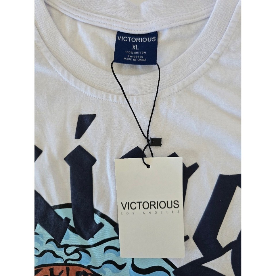 Keywords: Victorious T-Shirt, Mens Graphic Tee, Tiger Print Shirt, Wave Graphic Tee, King T-Shirt, Streetwear T-Shirt, XL T-Shirt, White Cotton Tee, Gothic Font Shirt, Bold Graphic, Mens Casual Shirt, New With Tags, Mens Fashion, T-shirt Design