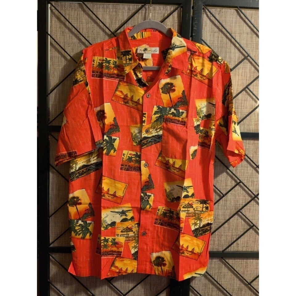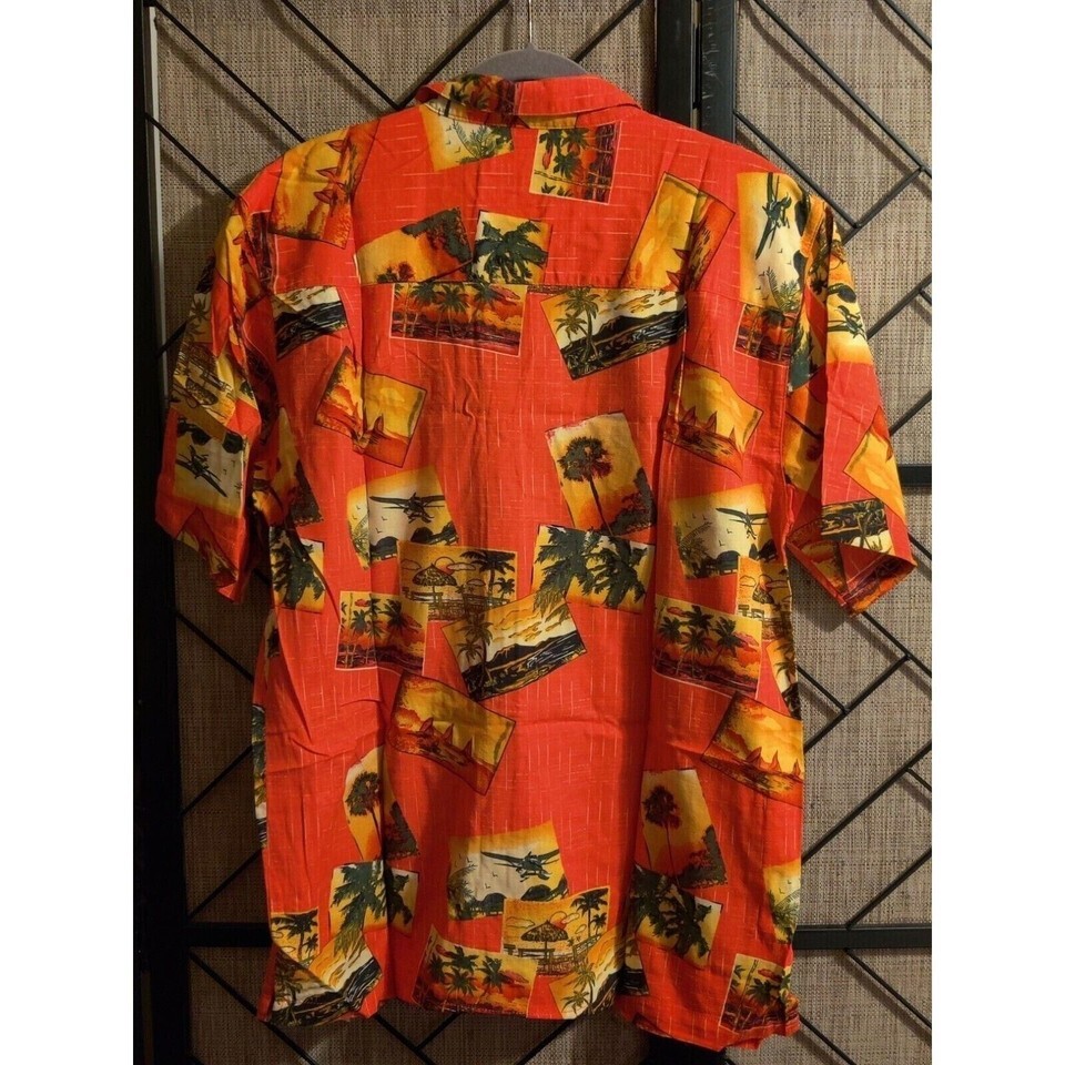 Joe Marlin Mens Aloha Hawaiian Shirt Tropical Beach Scene Red Size L