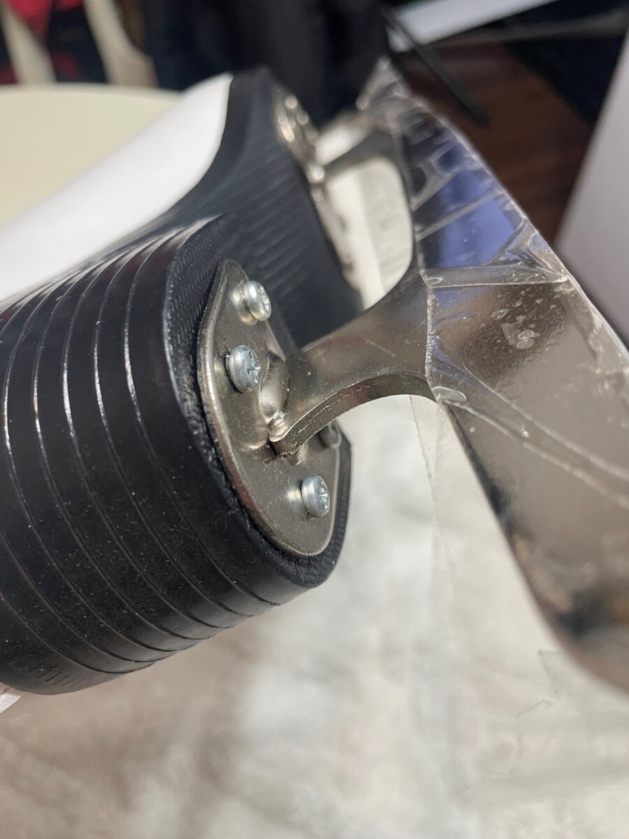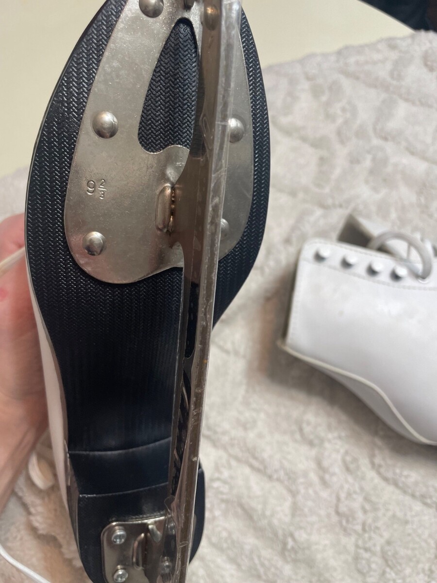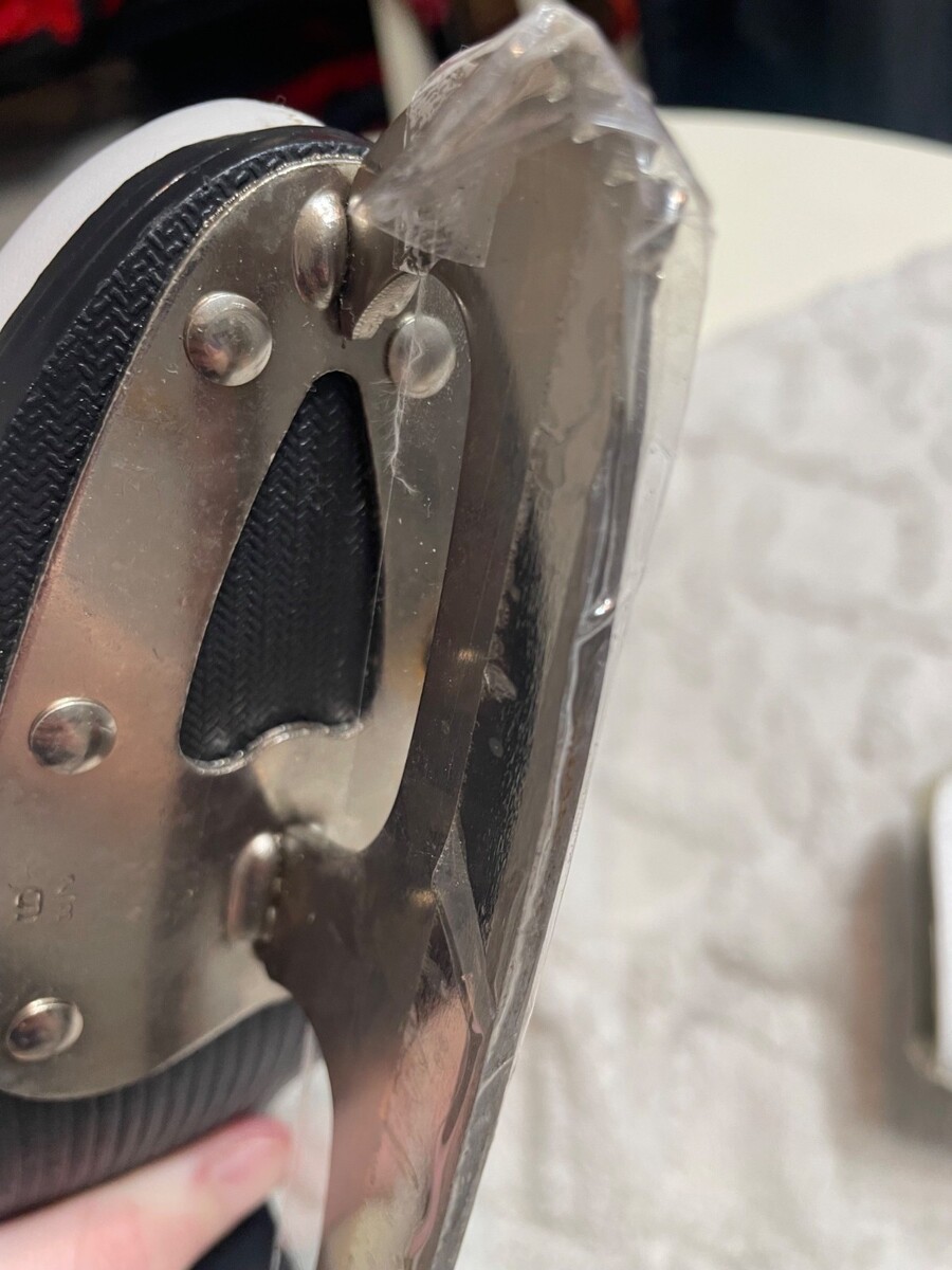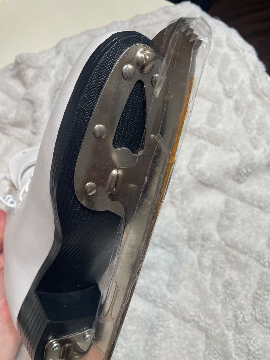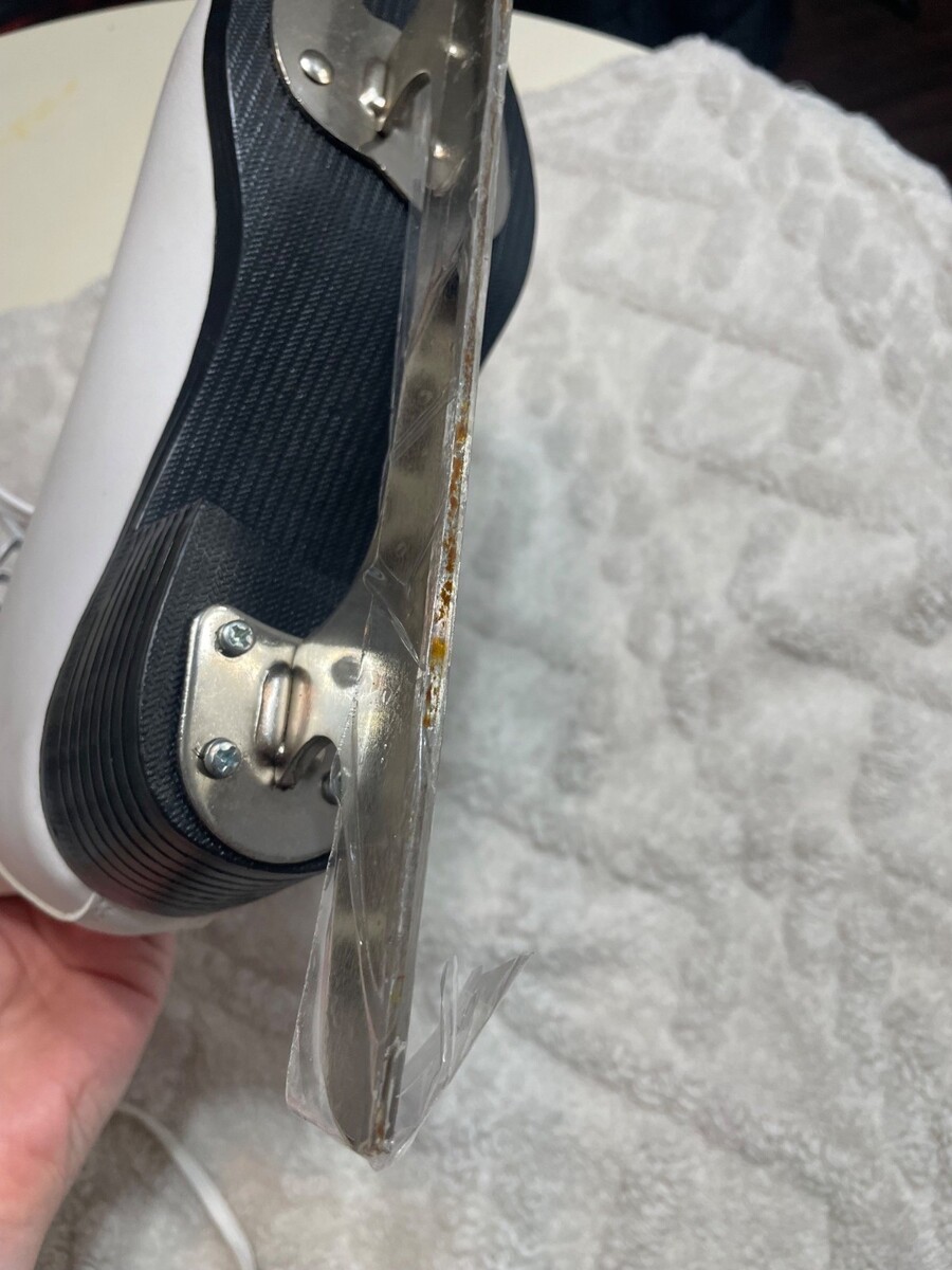 Pre-owned and in good condition. Shows light cosmetic wear from normal use, including minor discoloration/yellowing near the lace area and interior padding. Light surface rust spots visible on blade edges due to storage (common for ice skates and can be sharpened out). Clear protective tape is present on the blades and can be removed. No cracks or structural damage. Stitching intact.