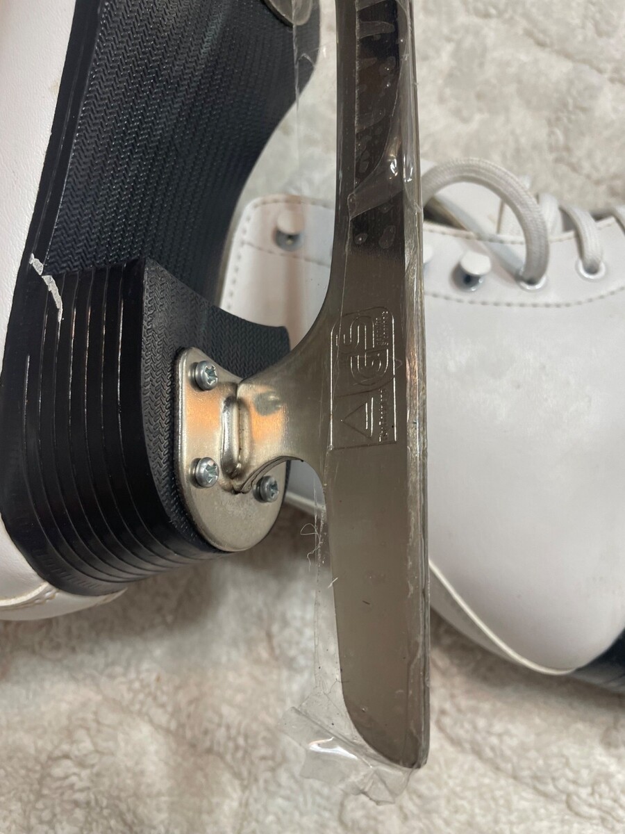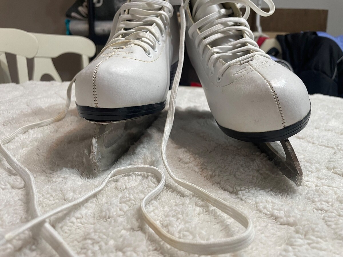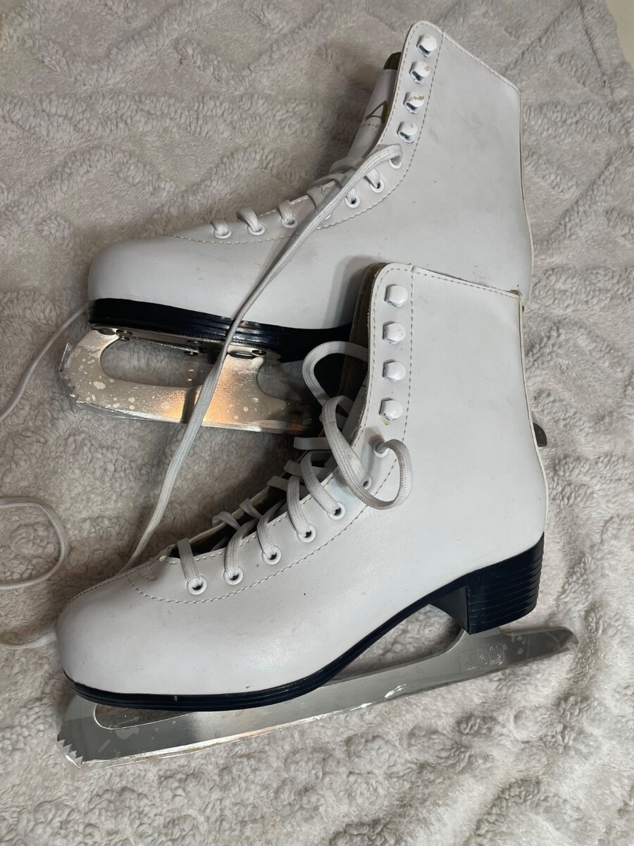 American Athletic white figure ice skates in women?s size 7 (EU 38). These lace-up recreational skates feature padded ankle support, a stainless steel blade with toe pick, and a classic traditional figure skating design suitable for casual skating, lessons, or seasonal winter use.