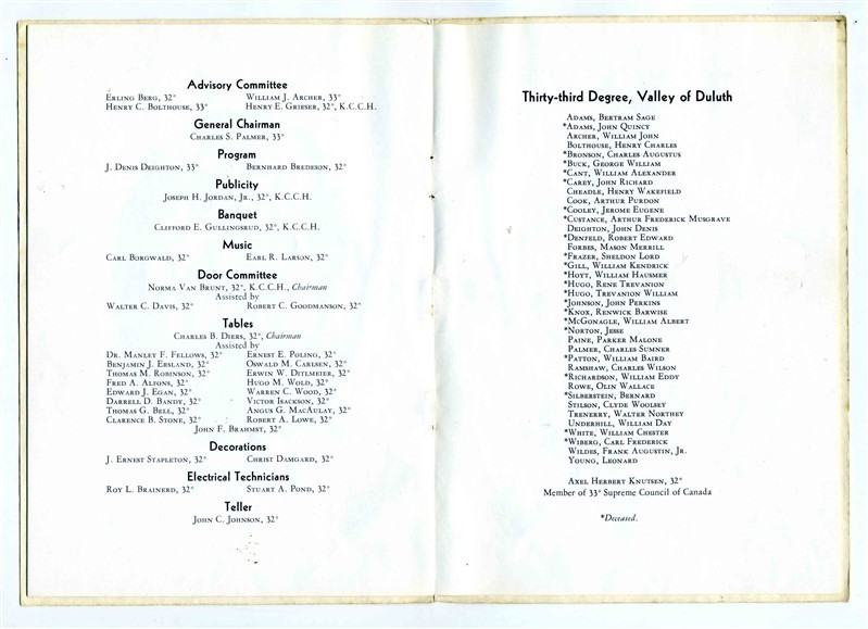 An 12 page menu and program in a decorative cover from the Duluth Consistory of The Ancient and Accepted Scottish Rite of Freemasonry , Spring Reunion Banquet held in 1940 at the Masonic Temple. Has a Dinner Menu, Salutation, Allegiance, Toasts, Photos of Dignitaries, Members of Committees, Thirty Third Degree Member and more. Measures about 5" x7" when closed