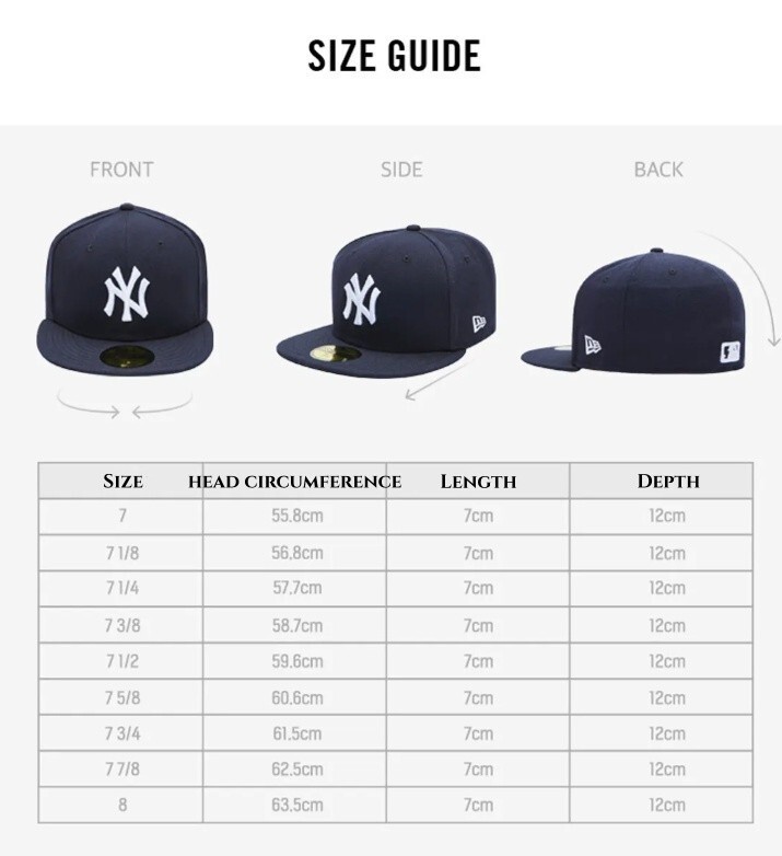 Main Features ---Brand : New Era ---Gender : Unisex Adults ---Material : 100% Cotton ---Color : Navy Size : 7(55.8cm), 7 1/8(56.8cm), 7 1/4(57.7cm), 7 3/8(58.7cm), 7 1/2(59.6cm), 7 5/8(60.6cm), 7 3/4(61.5cm), 7 7/8(62.5cm), 8 (63.5cm)