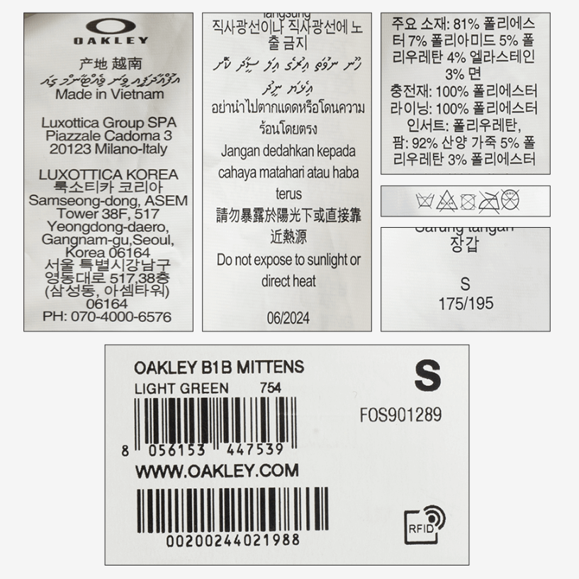 Main Features #8203; #8203; #8203; #8203; #8203; #8203; #8203; #8203; #8203; #8203; #8203; #8203; #8203; #8203; ---Brand : Oakley ---Gender : Unisex Adults ---MPN : FOS901289754 ---Color : Light Green ---Material : Main Material: 81% Polyester, 7% Polyamide, 5% Polyurethane, 4% Elastane, 3% Cotton Lining: 100% Polyester Insert: Polyethylene Palm: 92% Goat Leather, 5% Polyurethane, 3% Polyester ---Size : XS, S, M, L, XL