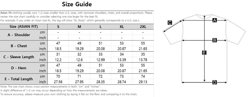 Asian Fit refers to clothing tailored for body shapes commonly found in Asian populations. These items typically run 1-2 sizes smaller than U.S. sizes, with narrower shoulders, chest, and overall proportions. Please check the size chart carefully or consider sizing up for the best fit.