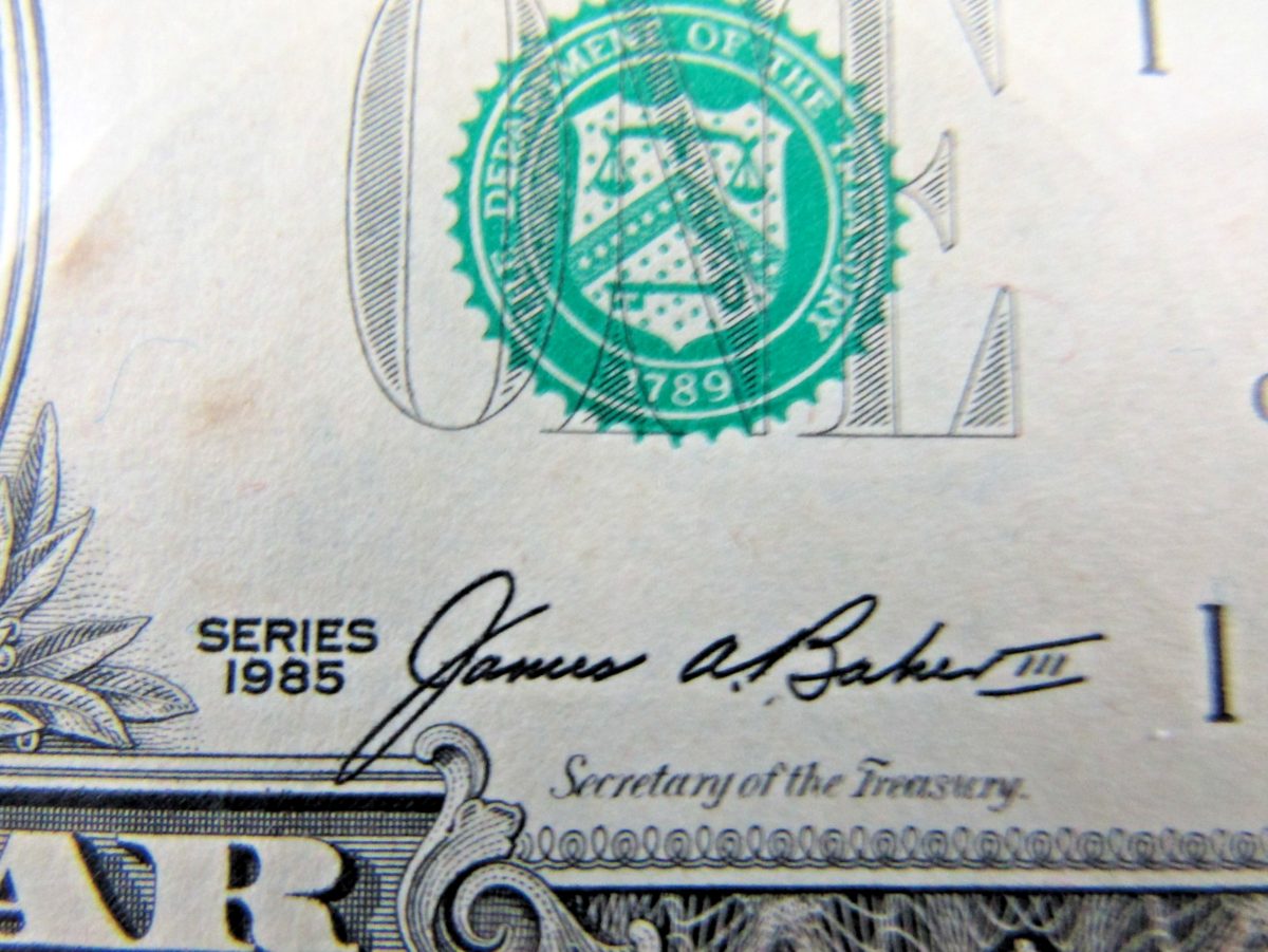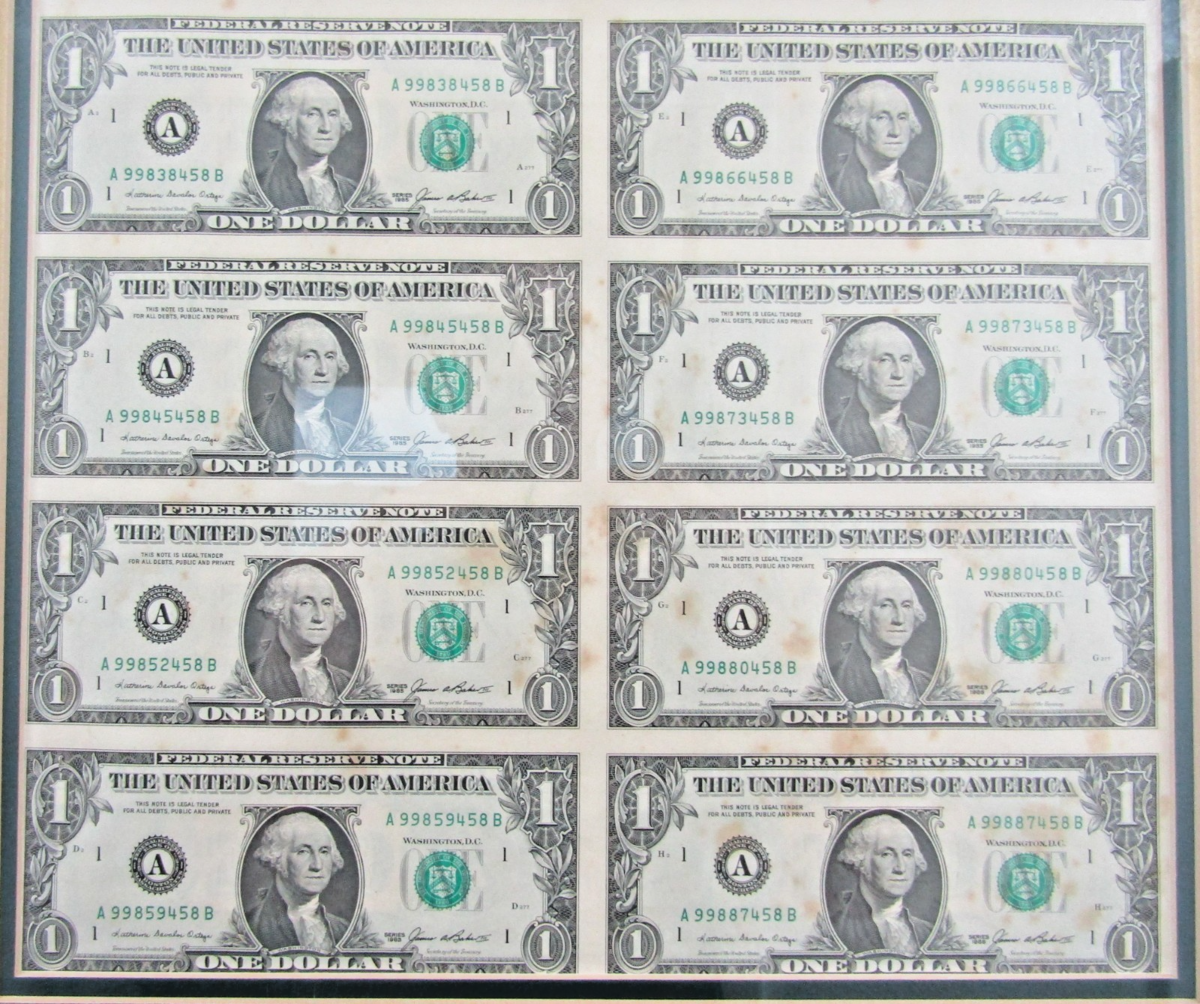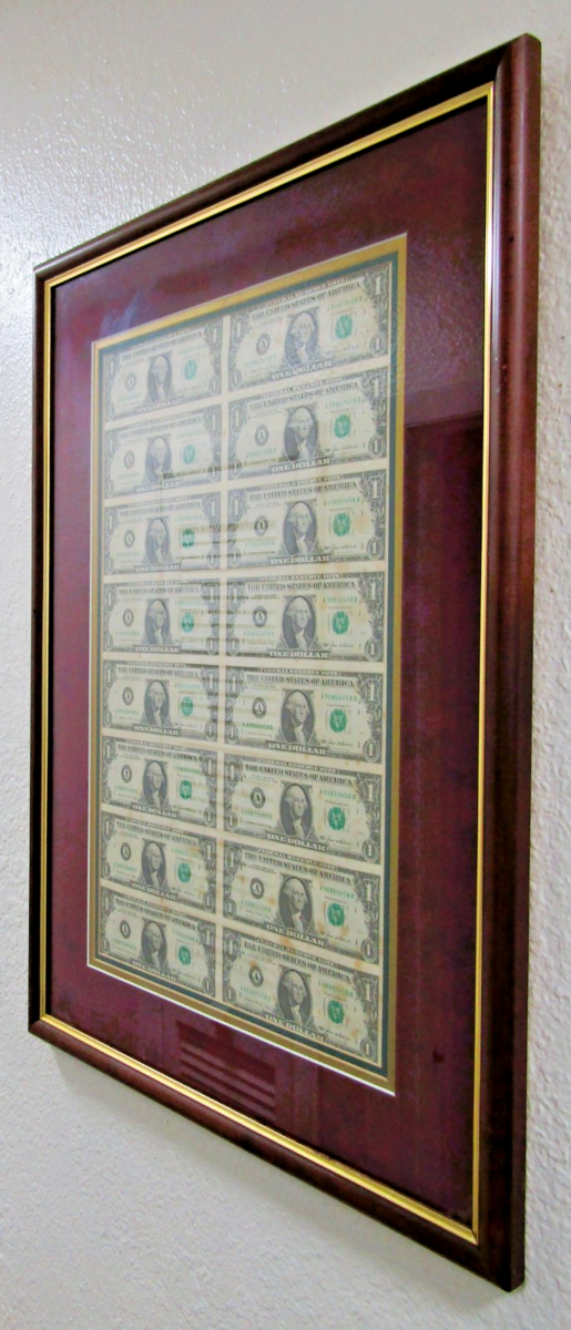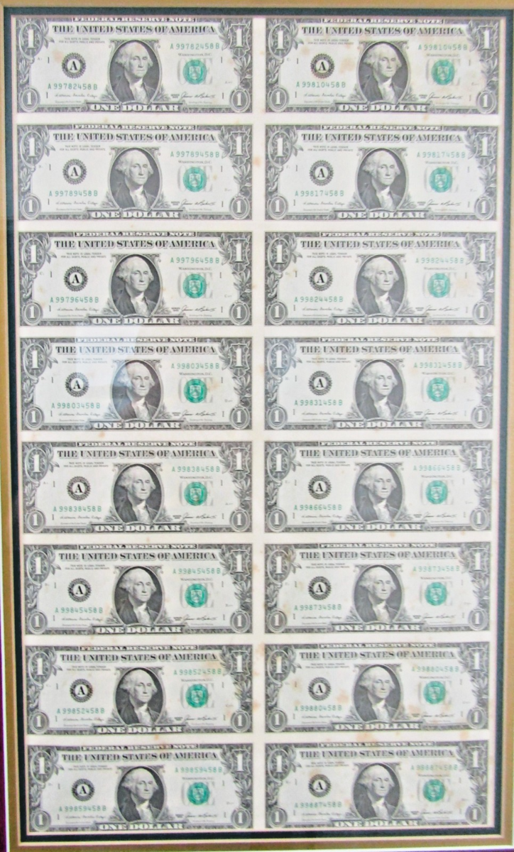 This is a framed uncut sheet of sixteen $1 US dollar bills, from the 1985 series. These sheets are produced by the Bureau of Engraving and Printing and are popular collectibles.
