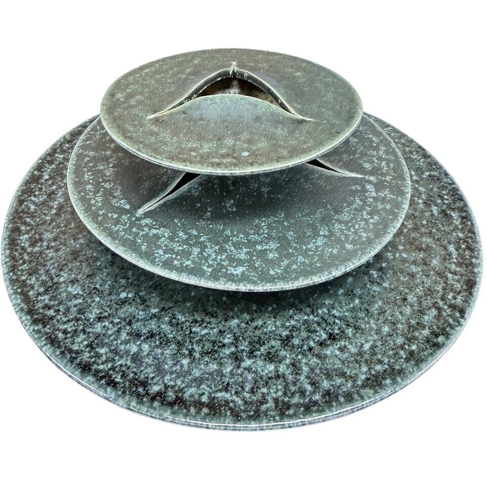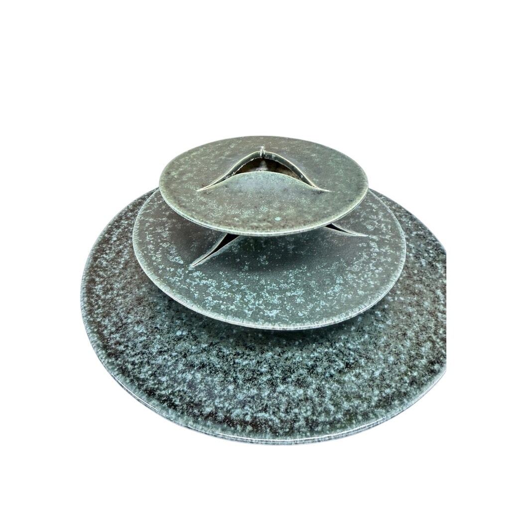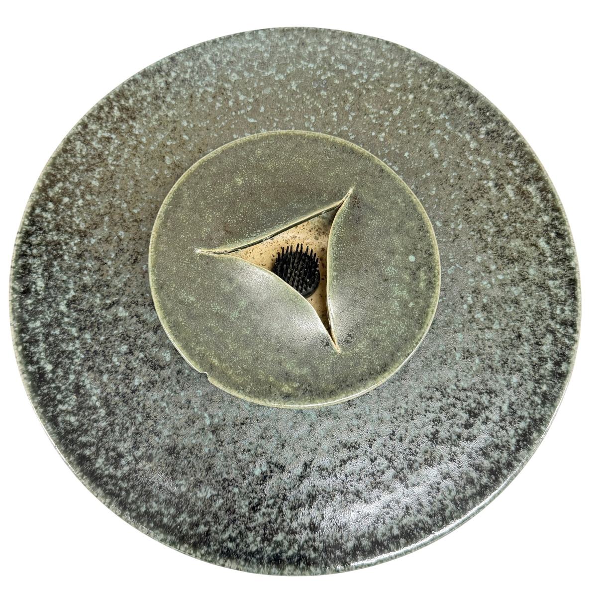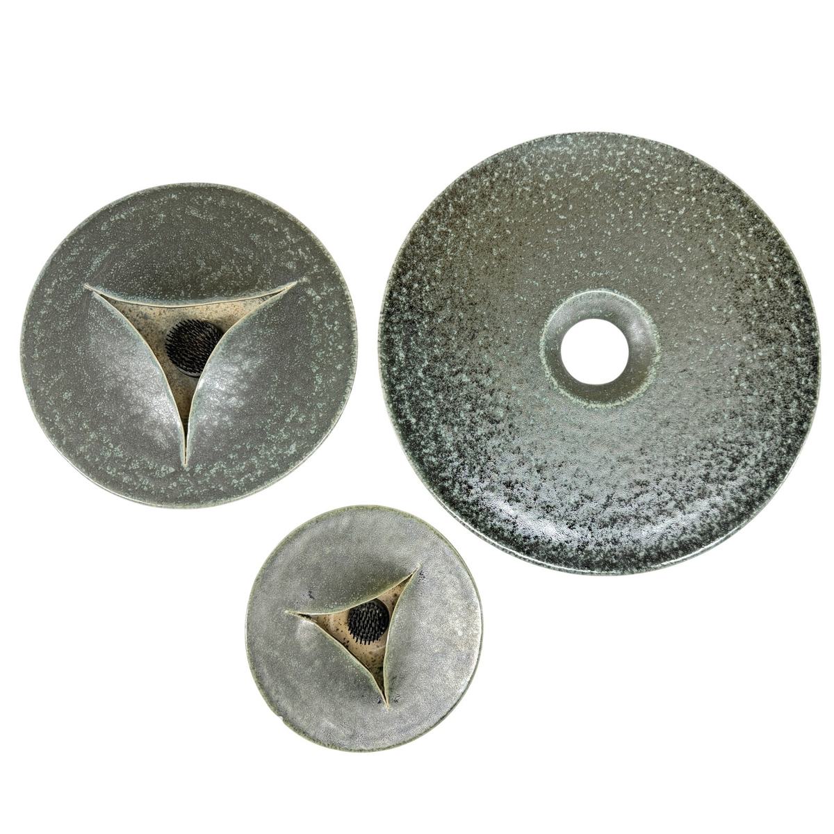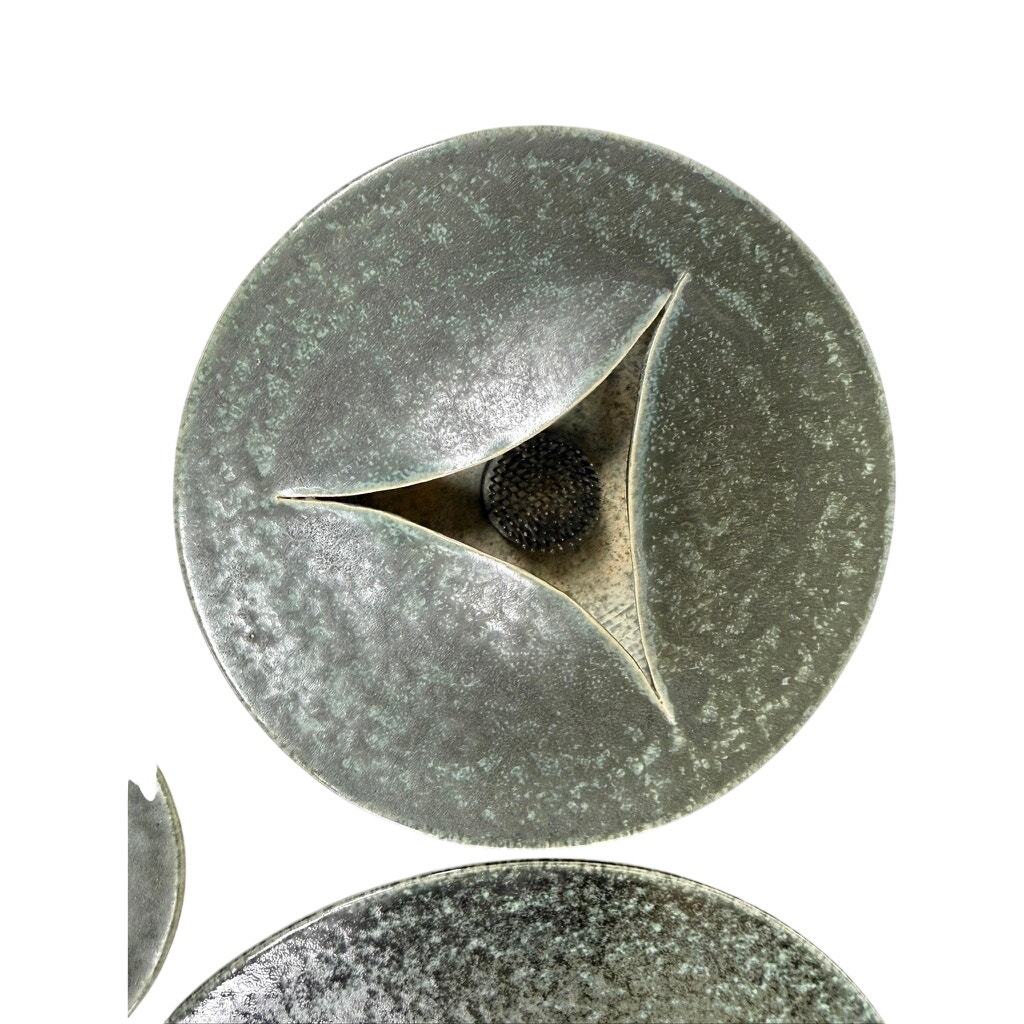 A striking modern studio pottery sculptural arrangement set featuring layered ceramic forms with pierced openings and integrated pin-style floral supports. Finished in a softly mottled green glaze with natural kiln variation, this piece reads as both functional and sculptural.