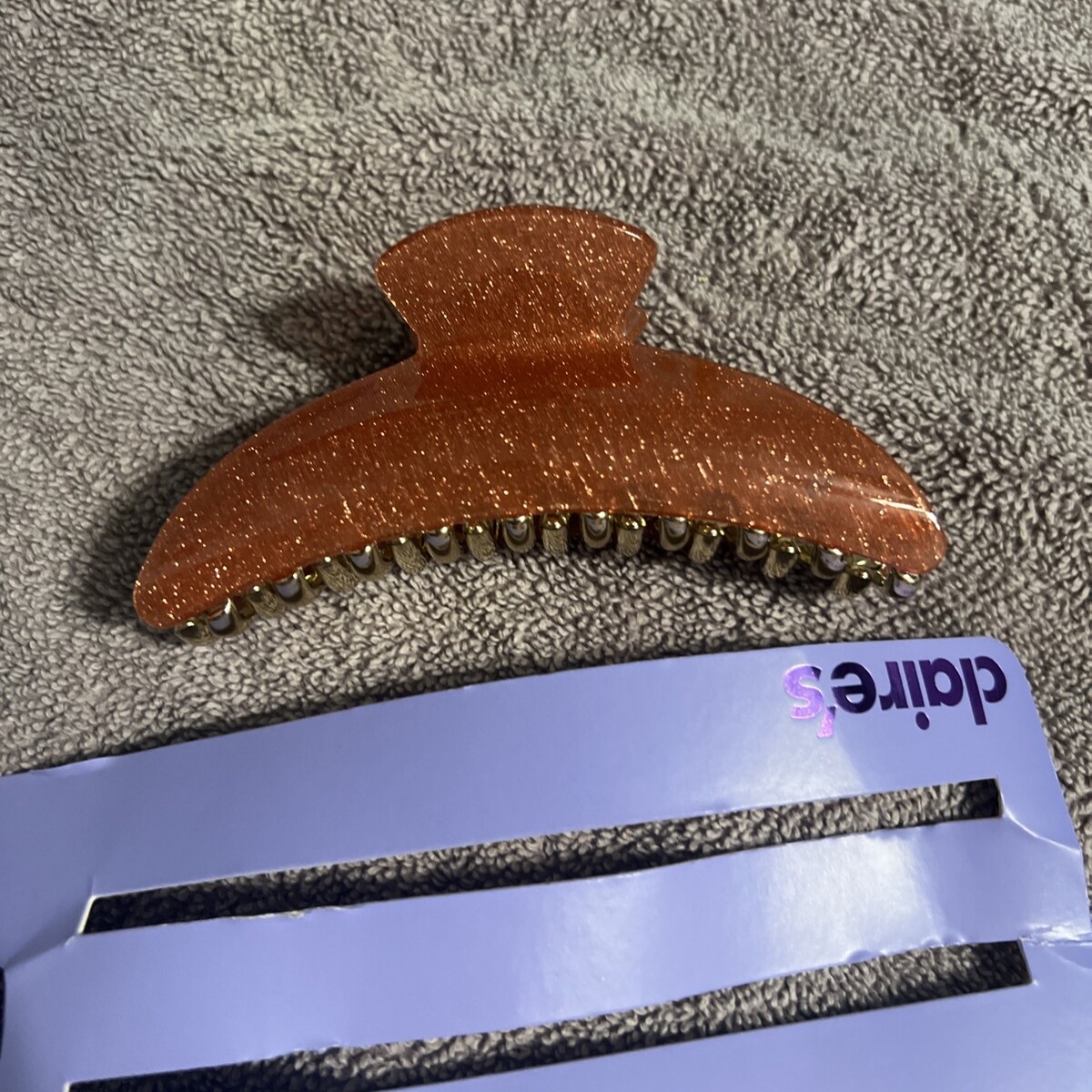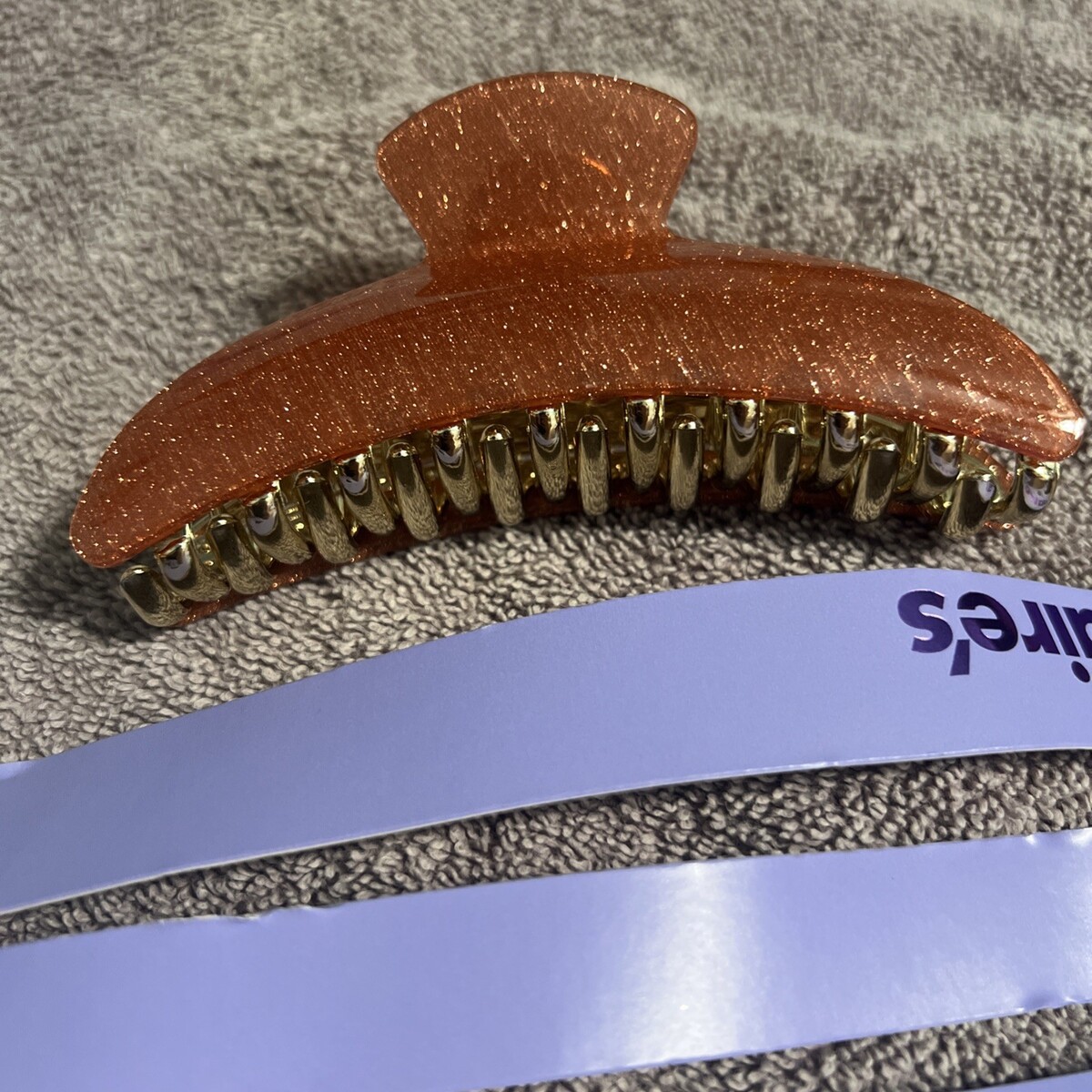 Beautiful copper/orange glitter hair claw clip from Claire?s featuring a metallic gold clasp and a sleek, modern shape. The shimmering finish adds a stylish touch to both casual and dressy hairstyles. Strong spring closure provides a secure hold for medium to thick hair. Brand new and still attached to the original Claire?s display card.