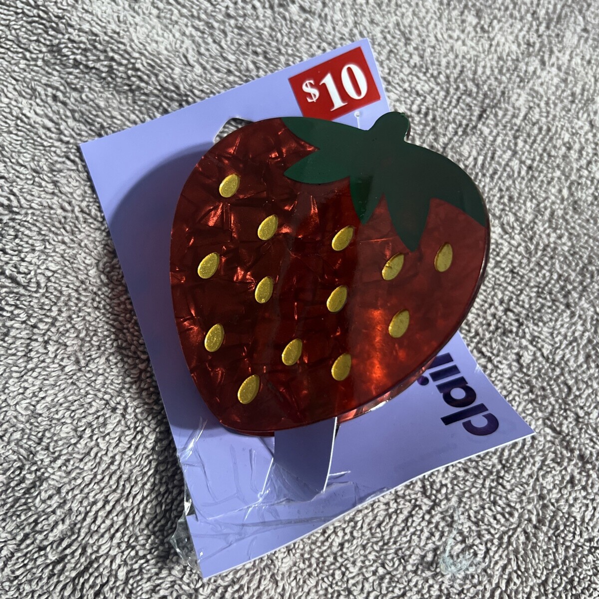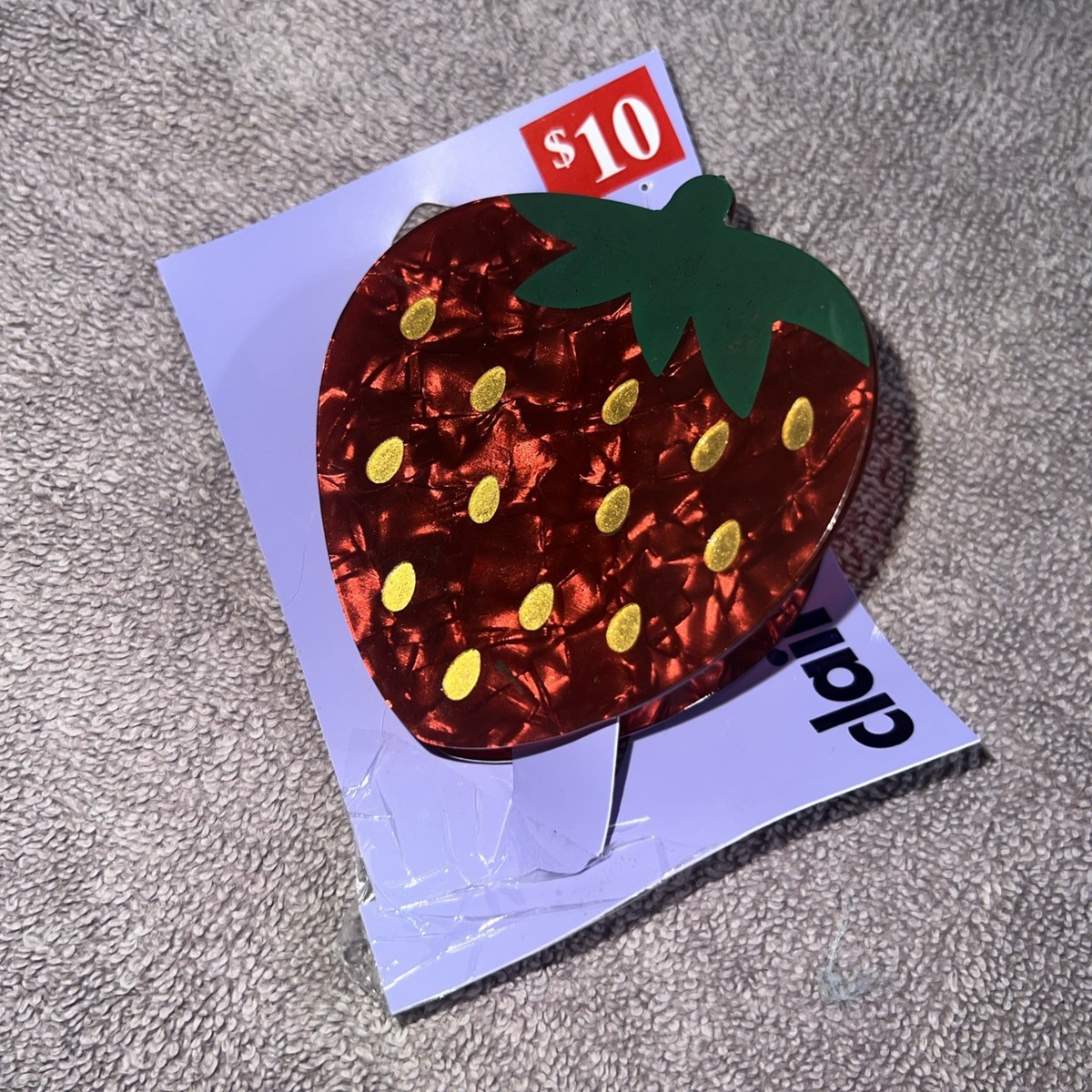 Fun and eye-catching strawberry hair claw clip from Claire?s featuring a glossy red acrylic finish with gold seed accents and a green leafy top. This whimsical fruit-shaped accessory adds a playful pop to any hairstyle and holds securely in place. Perfect for summer outfits, themed looks, or anyone who loves cute statement pieces. Brand new and still attached to the original Claire?s display card with $10 price tag.