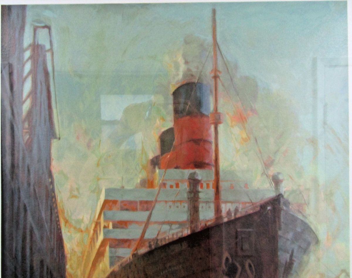 The large ship in the background is the Cunard Line ocean liner RMS Aquitania, which was converted to a troop transport ship during wartime.