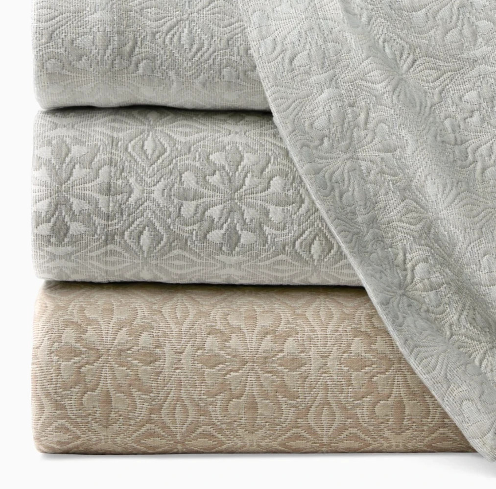 A nod to centuries-old tile motifs, Veroli’s intricate pattern is yarn-dyed and woven in Italy into a soft, lucent, lightweight coverlet and shams.