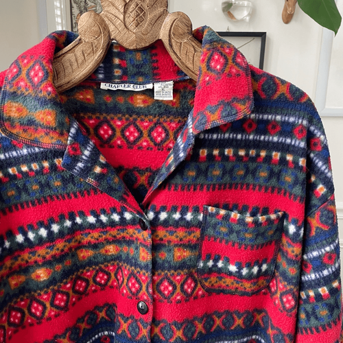 Vintage 90s Charter Club Fleece Barn Jacket Bold Fair Isle Red XL