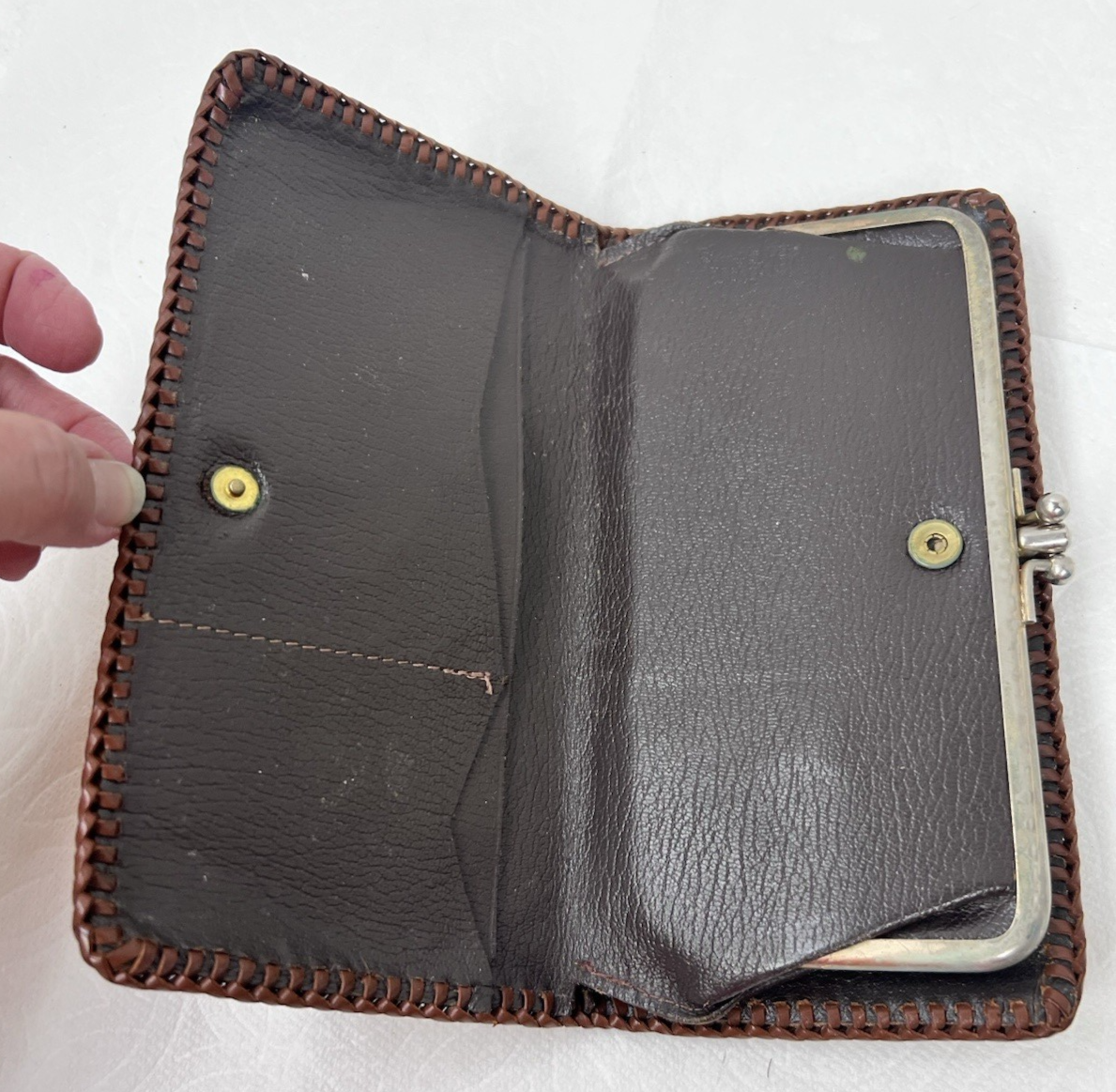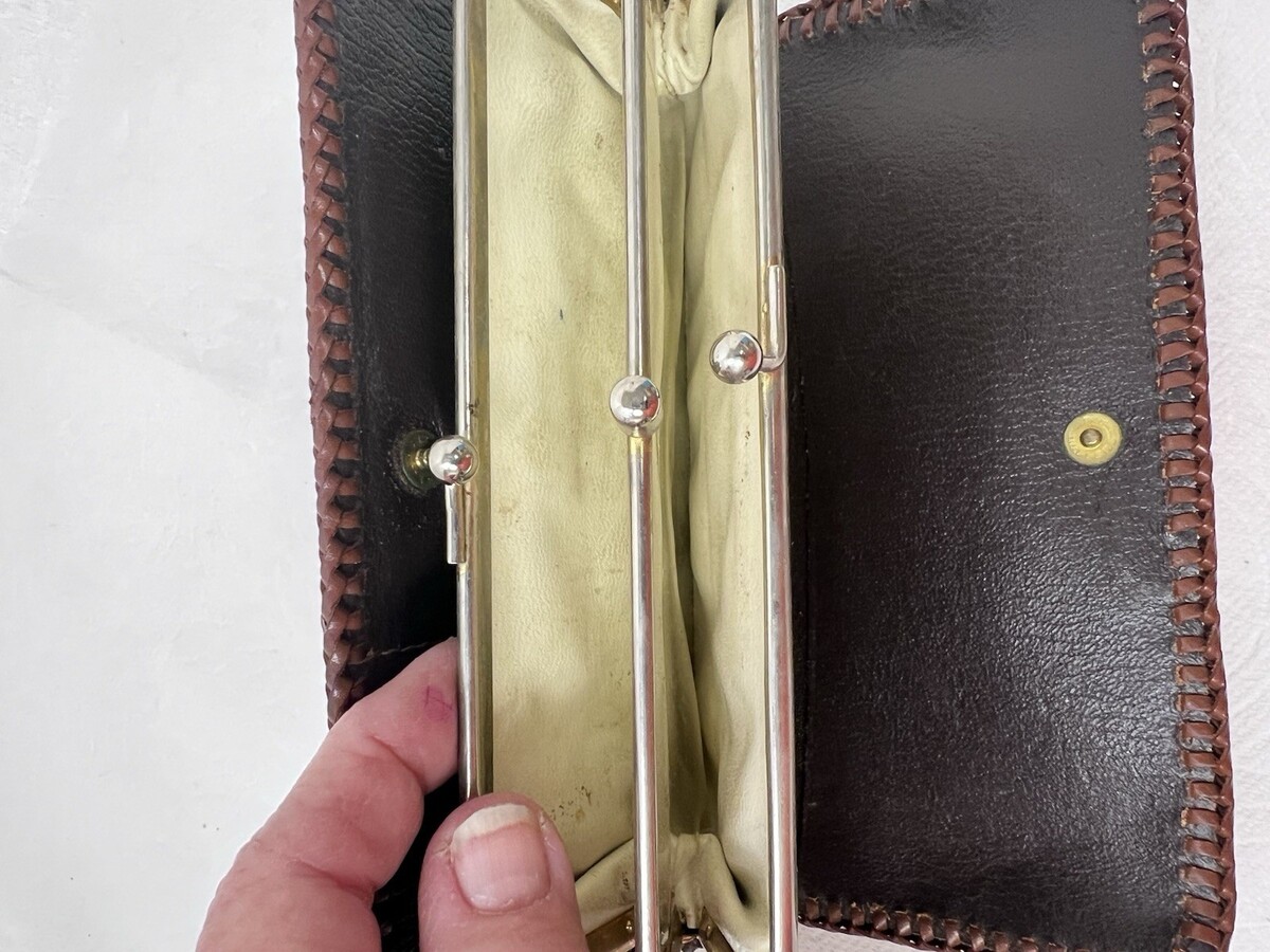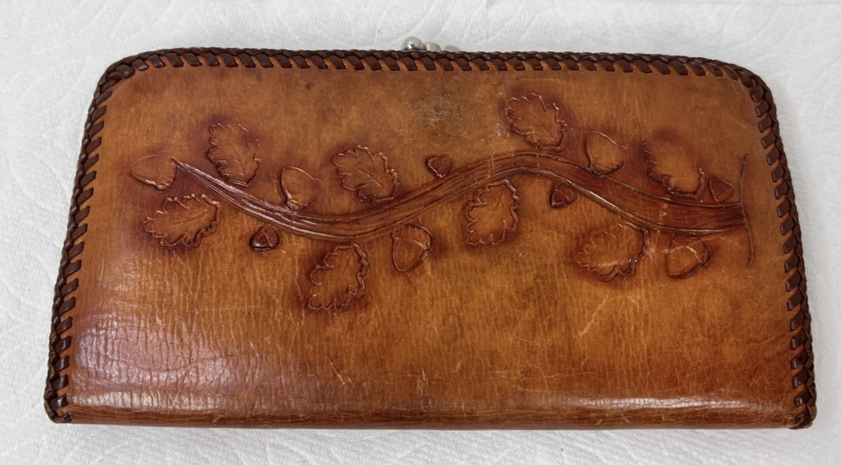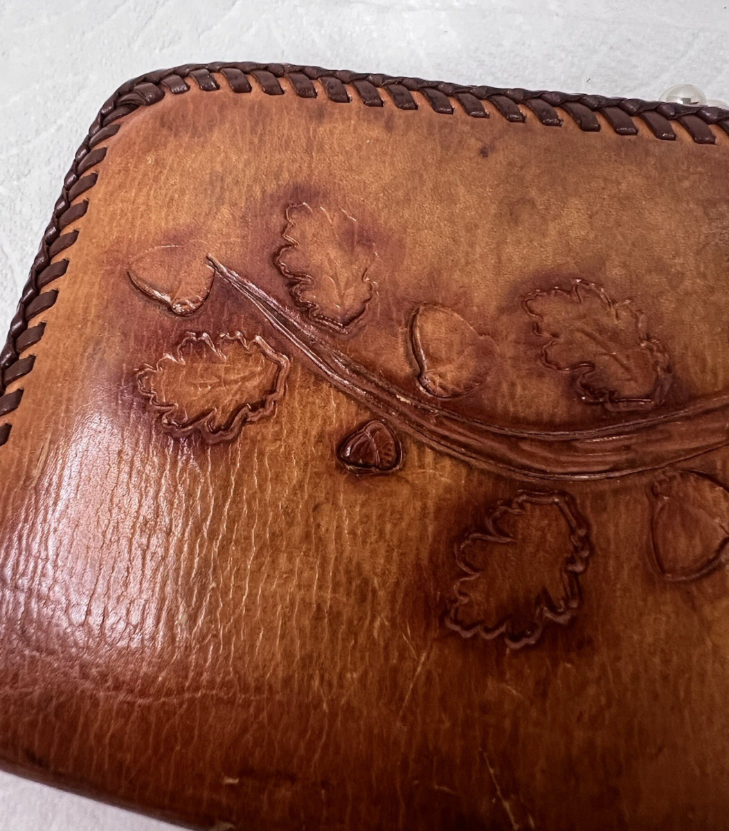 Hand Tooled Leather Wallet w Acorns Leaves Branch Center Clip 7.5 x 3 7/8 Inch used but in good shape, but it could use a good cleaning