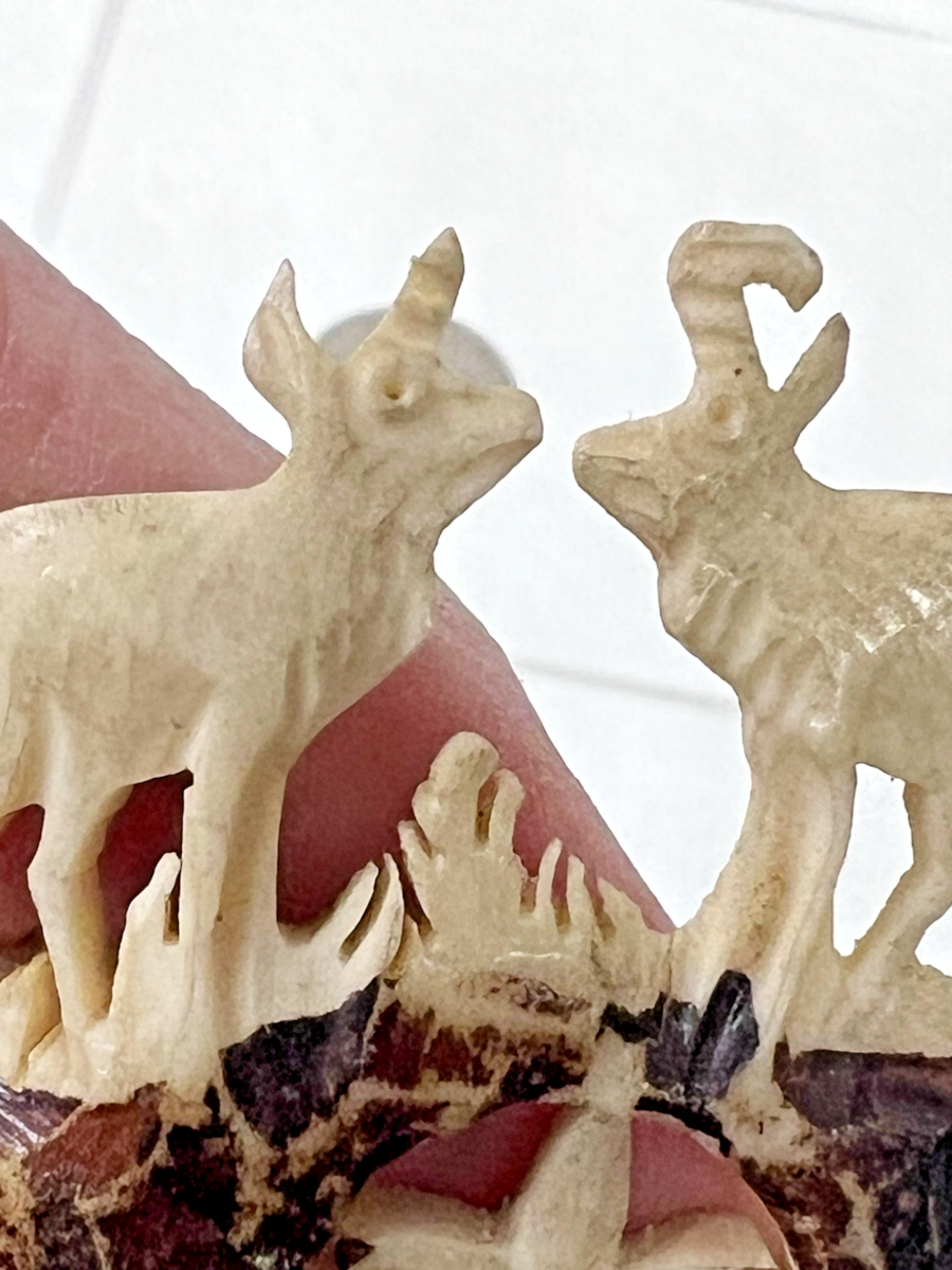 Antique Hand Carved Deer and Edelweiss Bavarian Old Souvenir Horn Possibly in good shape one deer has more of a unicorn style horn? it measures 1 1/4 x 7/8 across the base and stands 1 1/2 tall I've seen others being called a scarf slide but I'm not sure this is one?