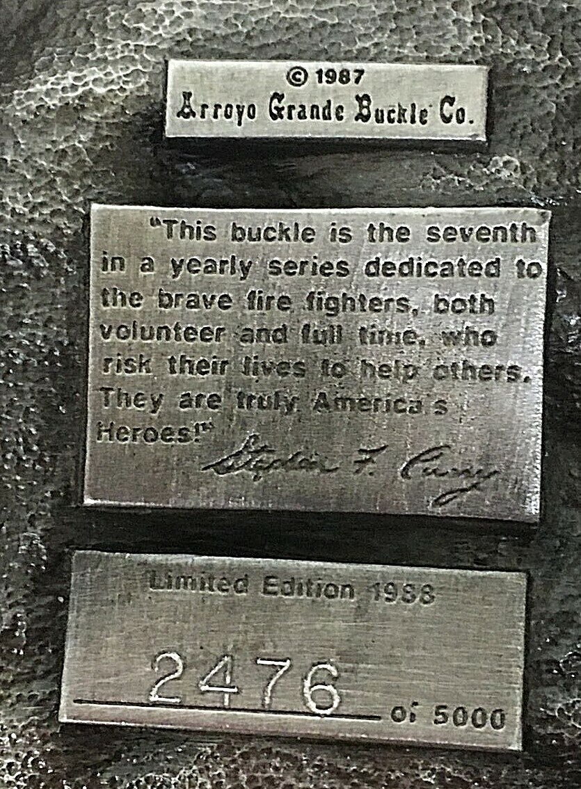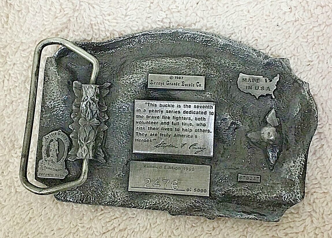 1988 American Firefighter Commemorative Silvertone Belt Buckle. Limited Edition numbered 2476 of 5000. 2.5 x 3.5" for 1.5 Inch Belt. In good unused condition. See photos.
