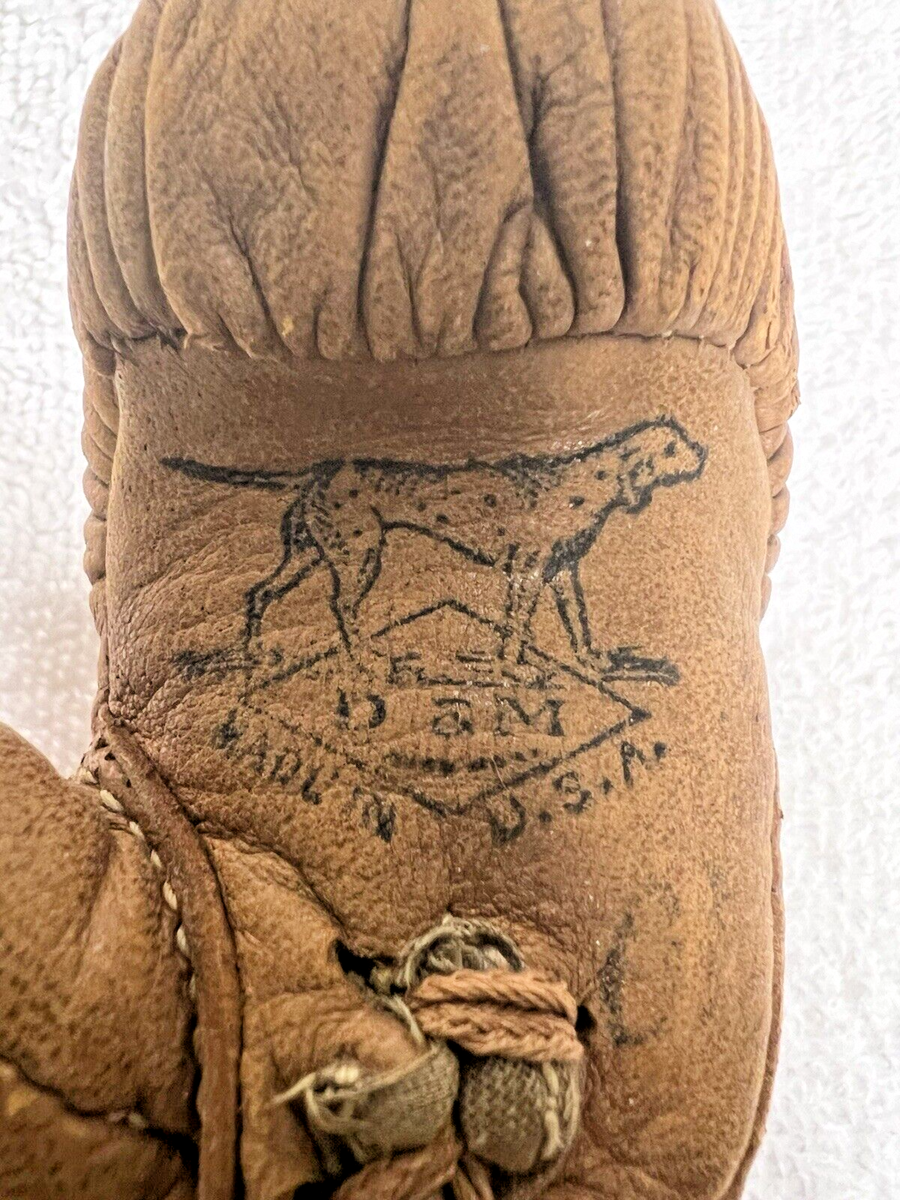D M USA Leather Miniature Boxing Glove Sample 4 Inch long x 2.5 at widest part w Dog Logo Has 1 dark dot (see photo) but in very nice shape