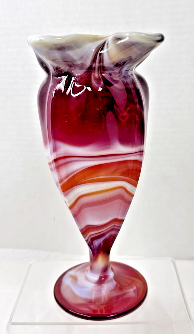 Vintage Imperial Red Slag Glass Footed Vase Pinched Top 9 1/4 inches tall base is 3.5 inch In great shape no chips or flakes colors are stunning