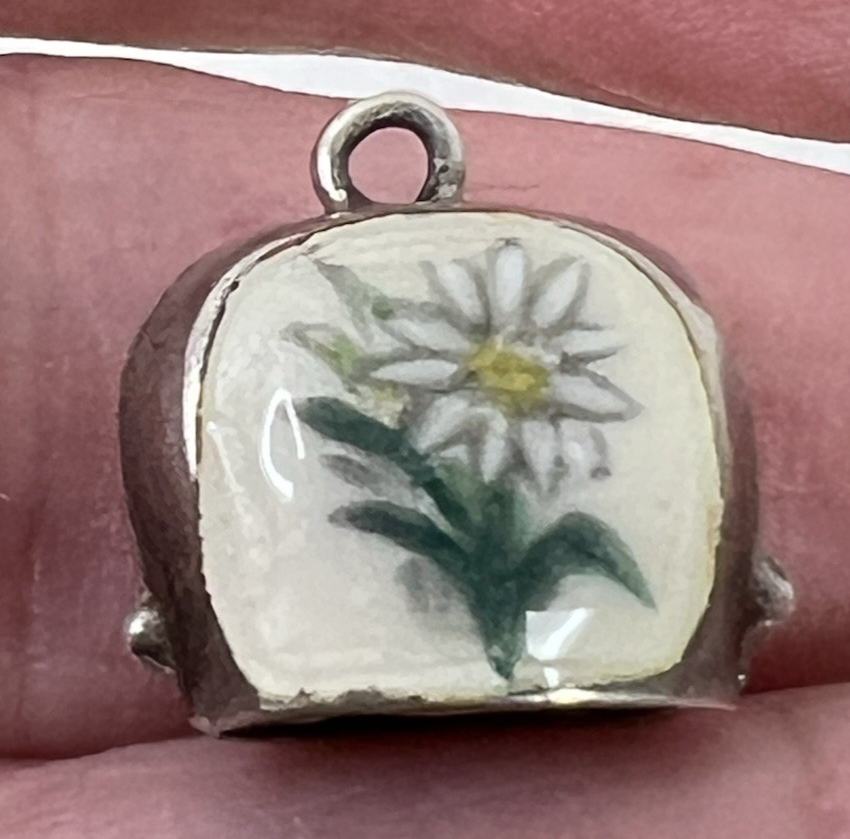 Antique Vintage German 800 Silver Enamel Edelweiss Cow Bell w Clapper Charm 1/2" wide just over 1/2 inches tall with the ring x 1/4 deep