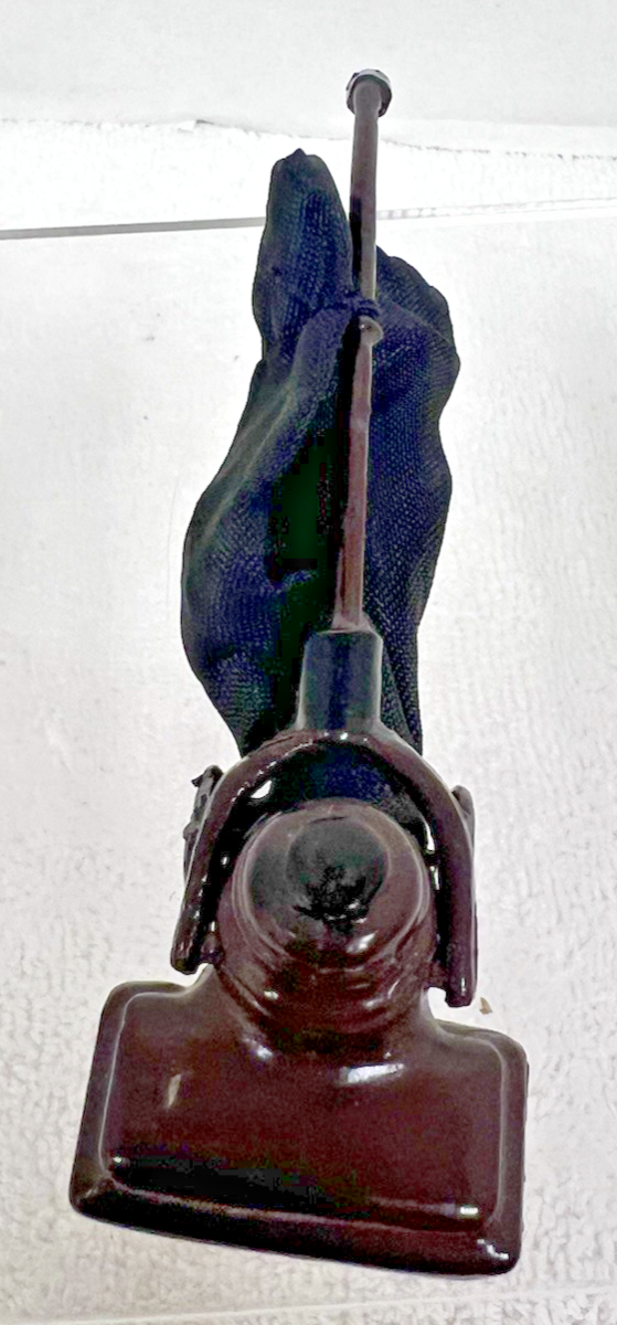Vintage Miniature Dollhouse Accessory Painted Metal Fabric Vacuum Cleaner. Modern looking brown painted metal and black fabric vacuum bag measures approx. 3 3/4" long. Very good condition miniature vacuum cleaner, paint in very good shape, no tears or holes in fabric I find. See pictures.