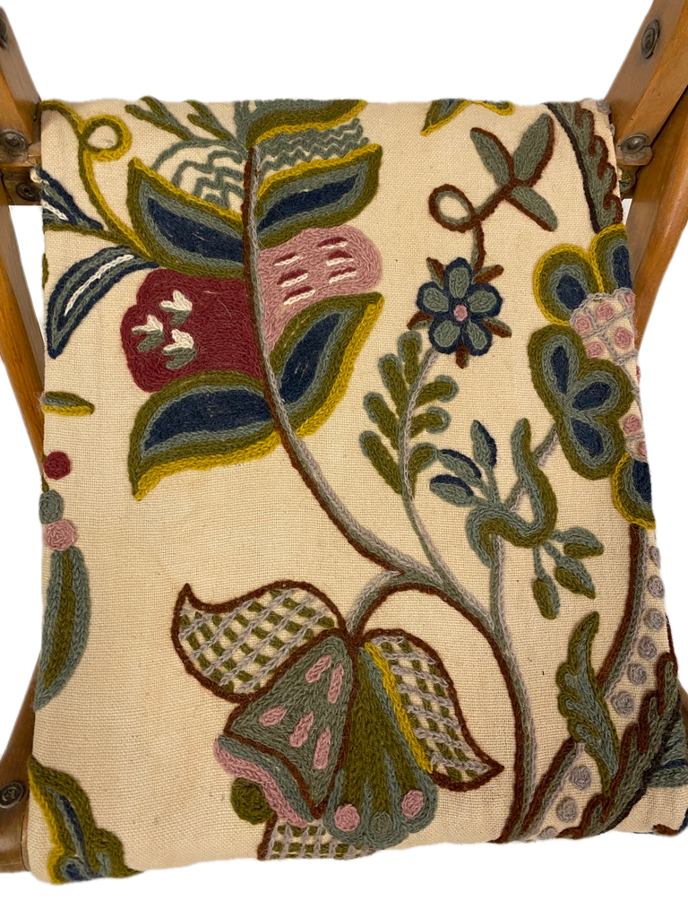 Vtg Mid Century Modern Wooden Maple Folding Chair Crewel Embroidery Fabric Seat