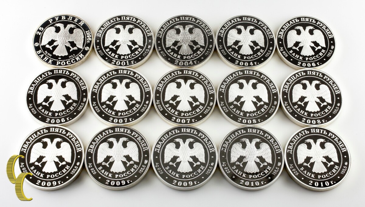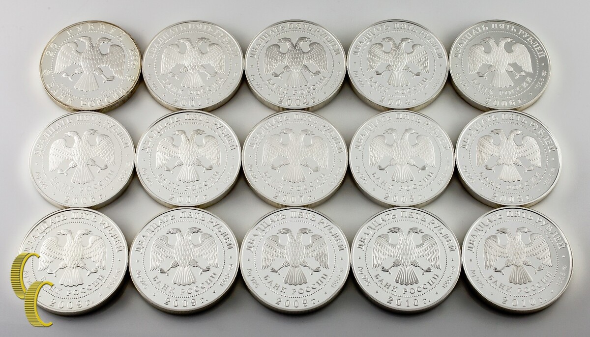 Lot of 15 5 oz. Russian 25 Ruble Rounds Sterling Silver 1996 - 2010 Proof