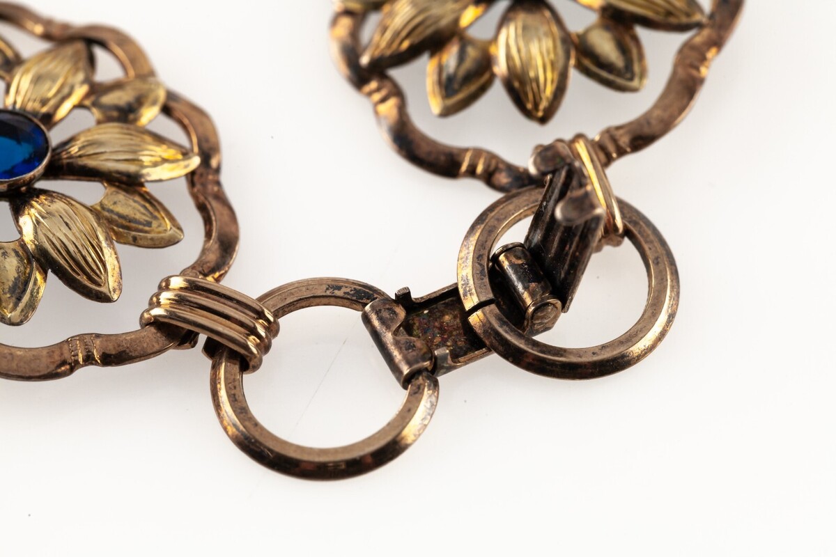 Art Deco 12k Gold Filled on Sterling Silver Faux Saphire Floral Bracelet 7"