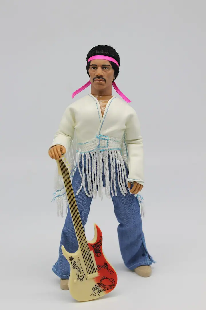 Jimi Hendrix Woodstock flocked The Jimi Hendrix Experience headlined the famous Woodstock concert in upstate New York. Now you can own an authentic Mego action figure of Jimi in this iconic outfit. This 8 inch figure comes with 14 points of articulation, a cloth outfit, and a replica of his famous guitar.