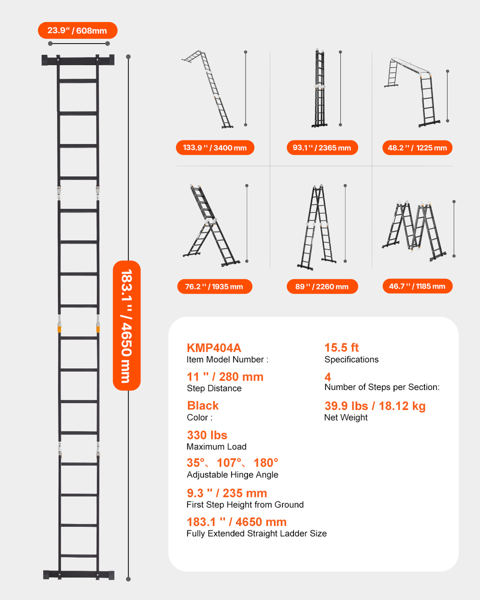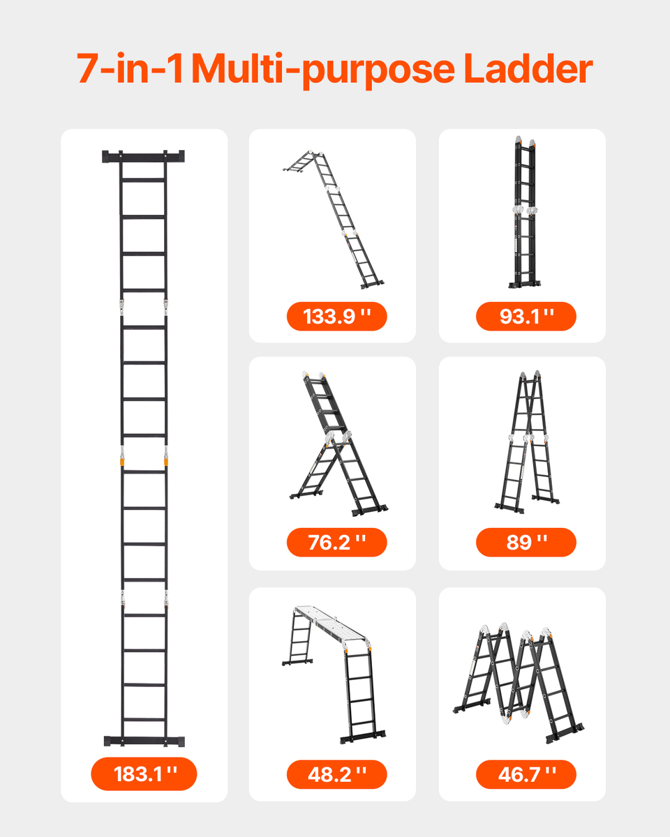 7-in-1 Versatility: This adjustable ladder can be folded into 7 shapes: A-frame, M-frame, ladder, L-shape, platform, folded, and straight. It is ideal for house cleaning, maintenance, home renovation, gardening, car washing, and more. It extends up to 183.1 '', making it easy to reach rooftops. Additionally, it comes with two scaffolding platforms (45.2 '' x 34.1 '') for added safety and versatility during use.