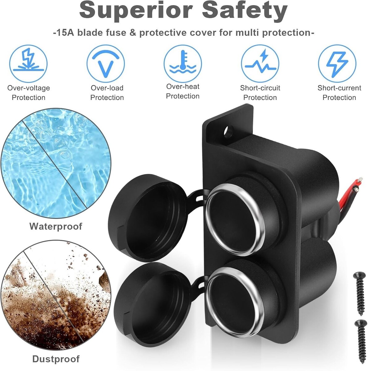 Come with a standard 15A in-line fuse, protect your device from over-voltage, over-heating, over-load, or short-circuit. Equipped with waterproof and dustproof cover, effectively protects the marine power outlet against sudden water splashes and influence of dust, avoid short-circuited and poorly contacted, which effectively prolongs the service life.