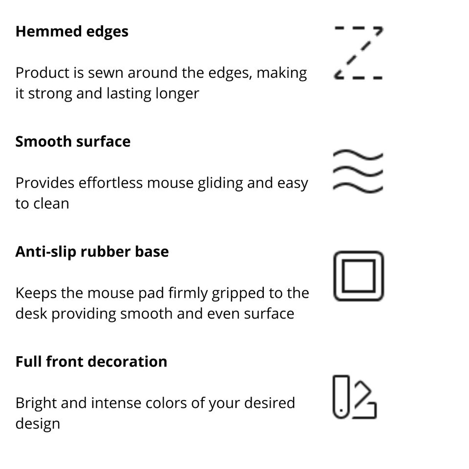 Whether it?s browsing, working, or gaming, these 9x7 inch personalized mouse pads deliver a smooth experience with a custom flair. All your designs are printed on the front side with dye sublimation for crisp details and bright colors. Meanwhile, the 0.11" thickness along with the stitched edges, add extra resilience and a professional feel to the mousepad.