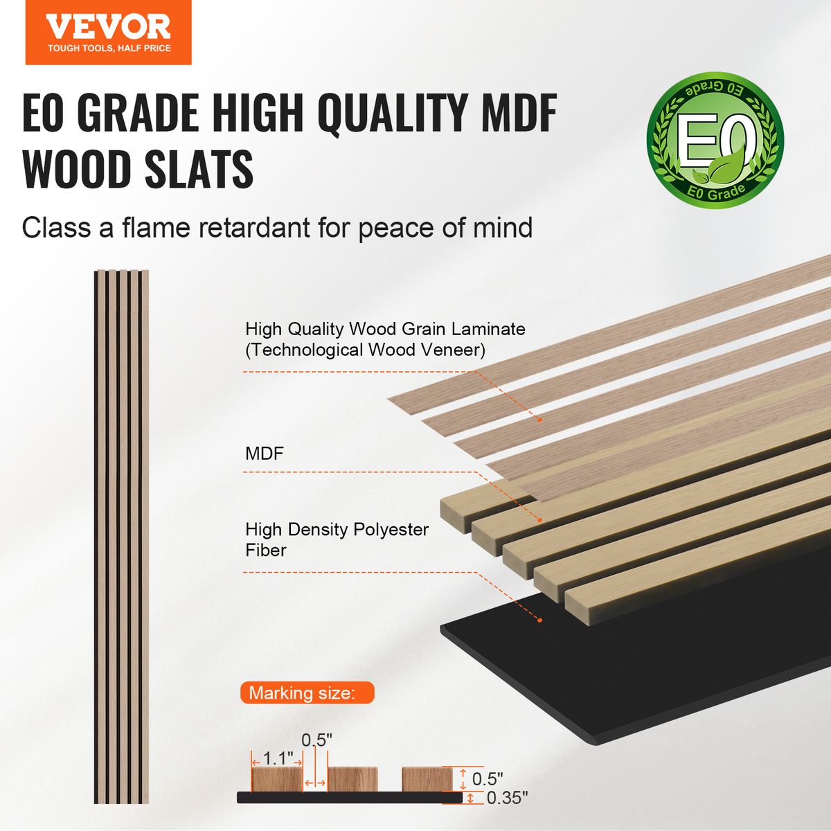 E0 Grade MDF Strips: These acoustic wall panels feature a three-layer structure, combining wood grain laminate, MDF material, and high-density polyester fiber. With formaldehyde emissions meeting E0 standards and a Class A fire rating, they ensure a safe and eco-friendly usage experience.