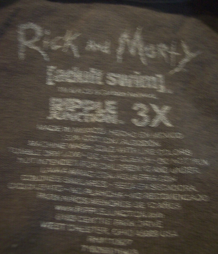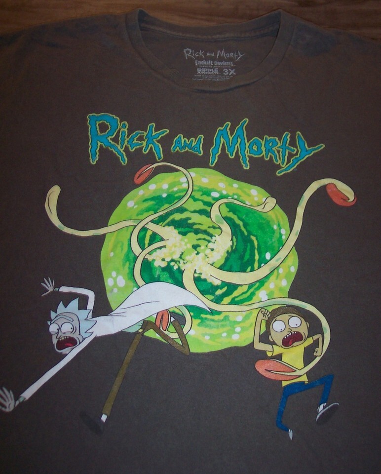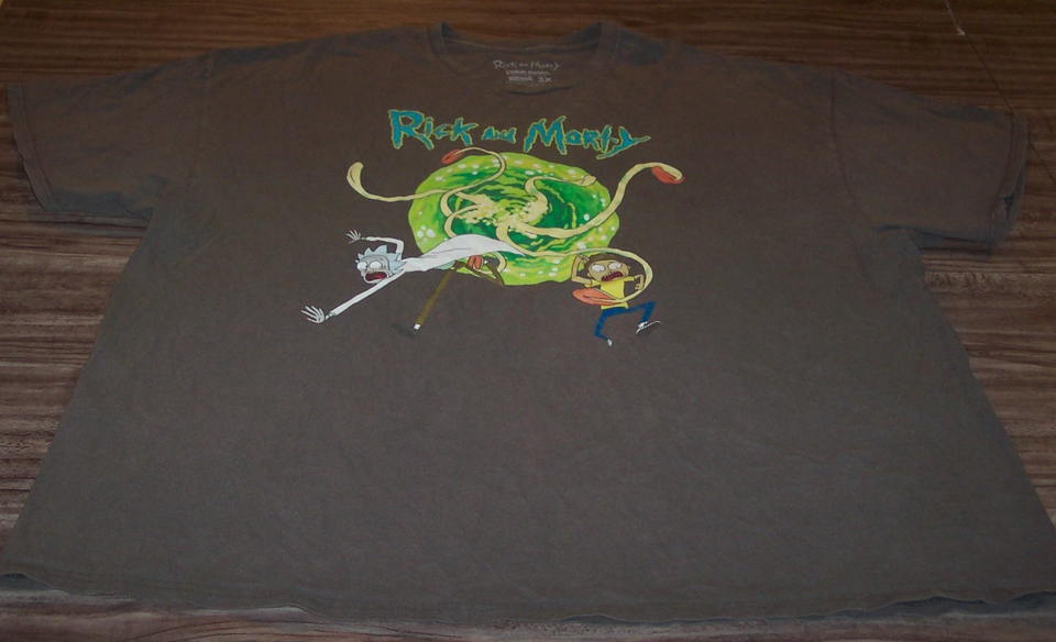 This is a RICK MORTY Spaceship Cartoon Network Adult Swim T-shirt. It is a size 3XL. It is 28 inches from armpit to armpit and 30 inches in length. It is shorter then a typical 3XL, but depending on your height it may fit you perfectly. Check measurements. It is in good condition. Minor wear from use, but nothing major. It is CLEAN! No Stains, Tears, or Defects. Combine auctions to save on shipping. AD