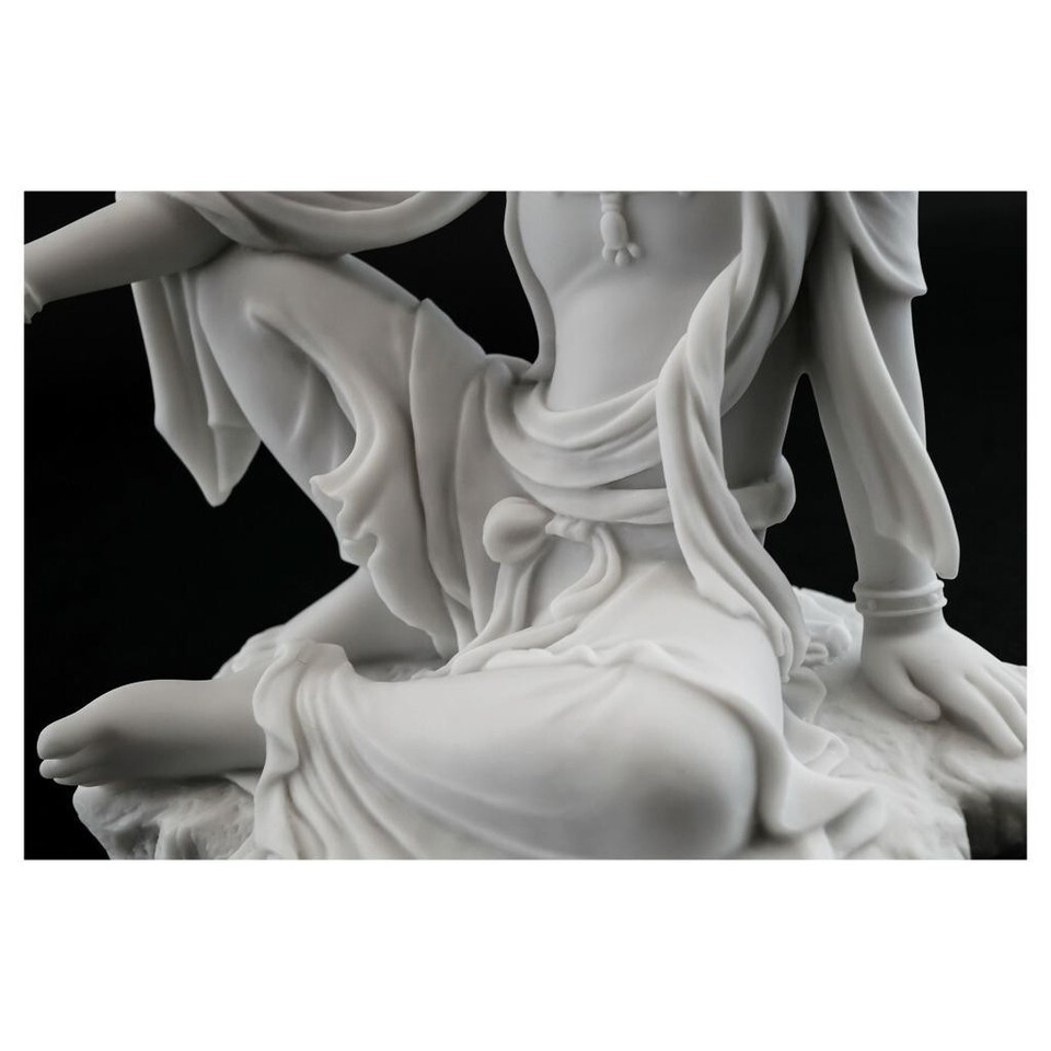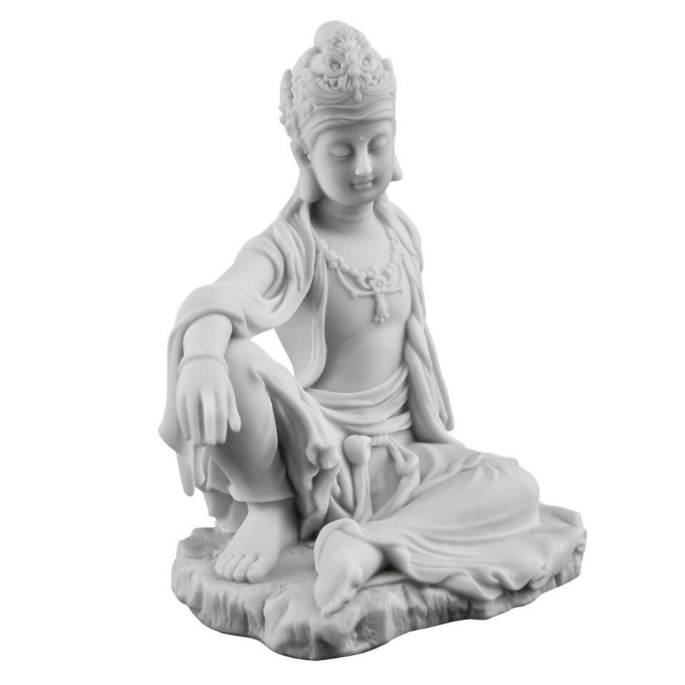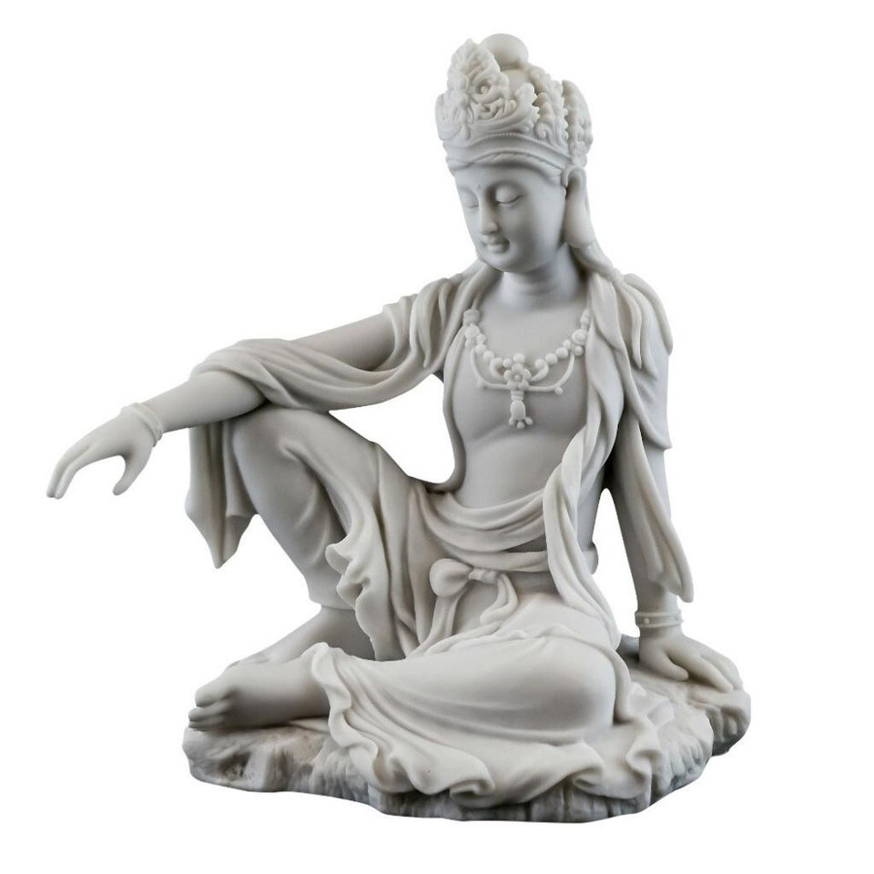 KWAN YIN STATUE 7.25" Royal Ease Buddhist Goddess White Marble Finish Resin Guan