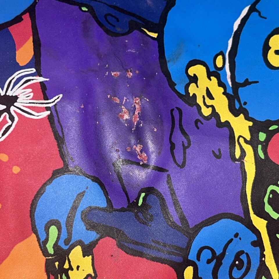 There is a hole on the front and some wear to the graphic. Please view pictures. Inside has some wear