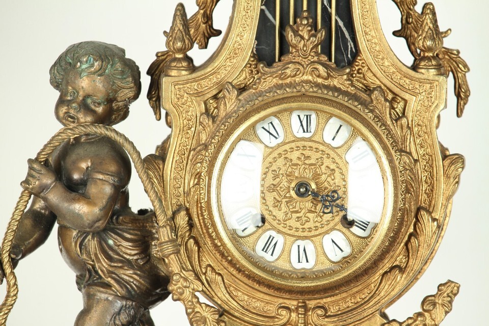 Clock is in very good condition, with the following exceptions: one missing faun/cherub figurine , the glass on the face is loose but intact, the marble base as a small chip on one of the rear facing corners, and clock's minute hand is missing.