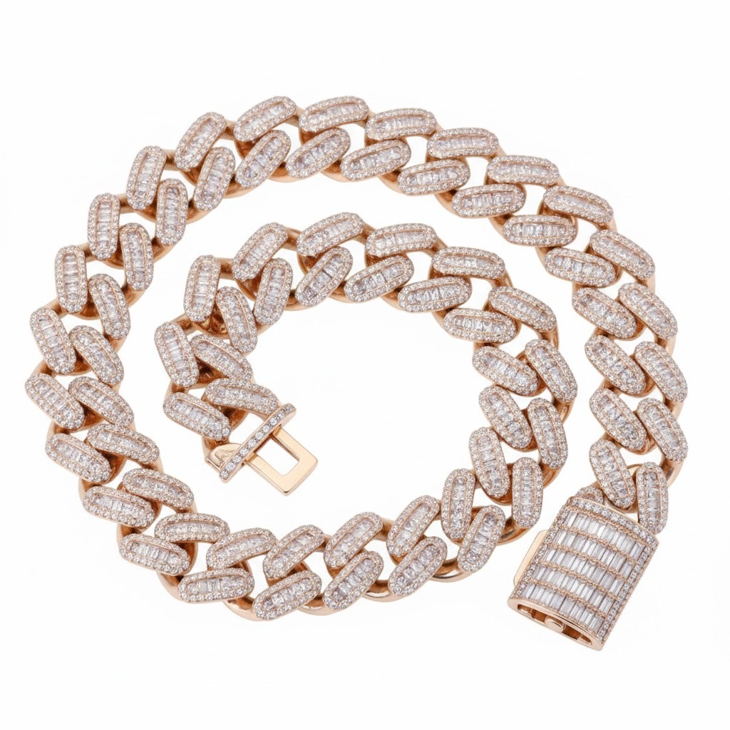 Exquisite Baguette Setting: Unlike standard Cuban chains, this model features large baguette-cut stones in the center of each link, surrounded by round micro-pave stones.