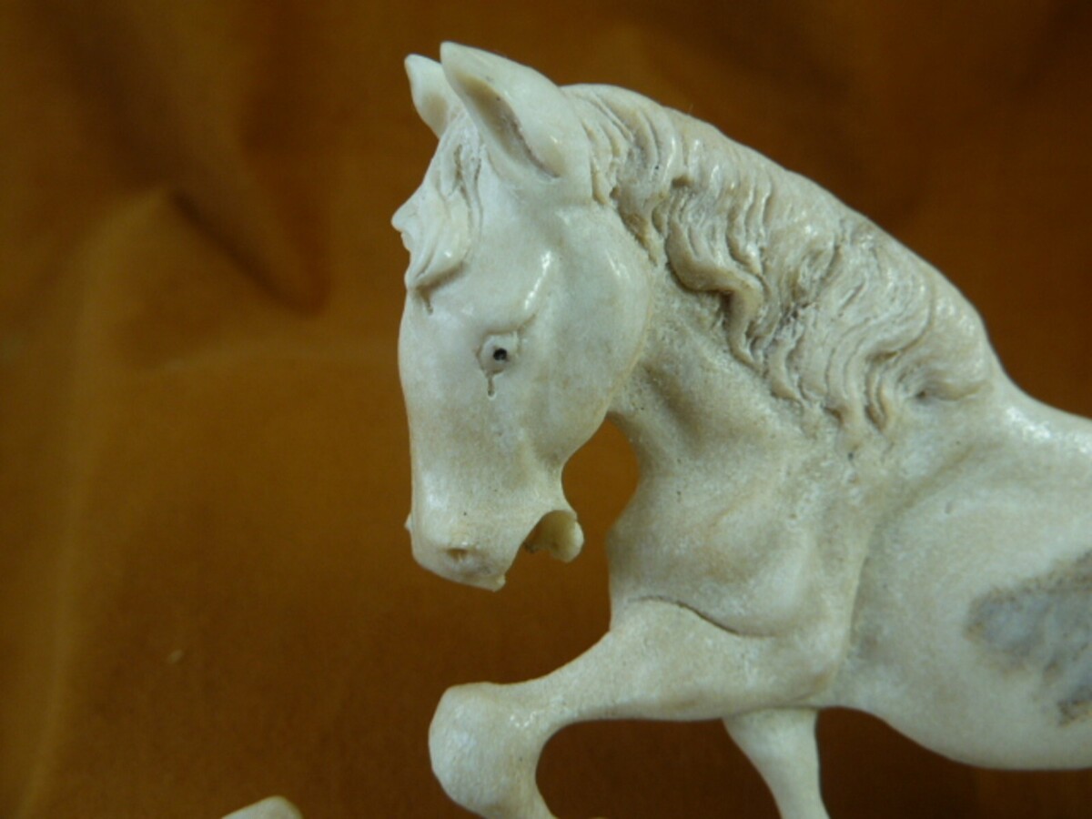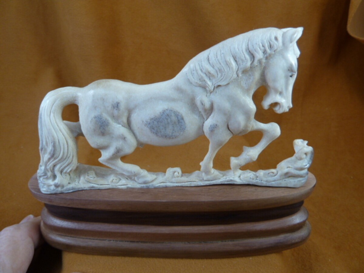 (#HORSE-16) Beautifully hand crafted, detailed figurine of a single Horse walking, shed moose antler, fully 3D, on wood base