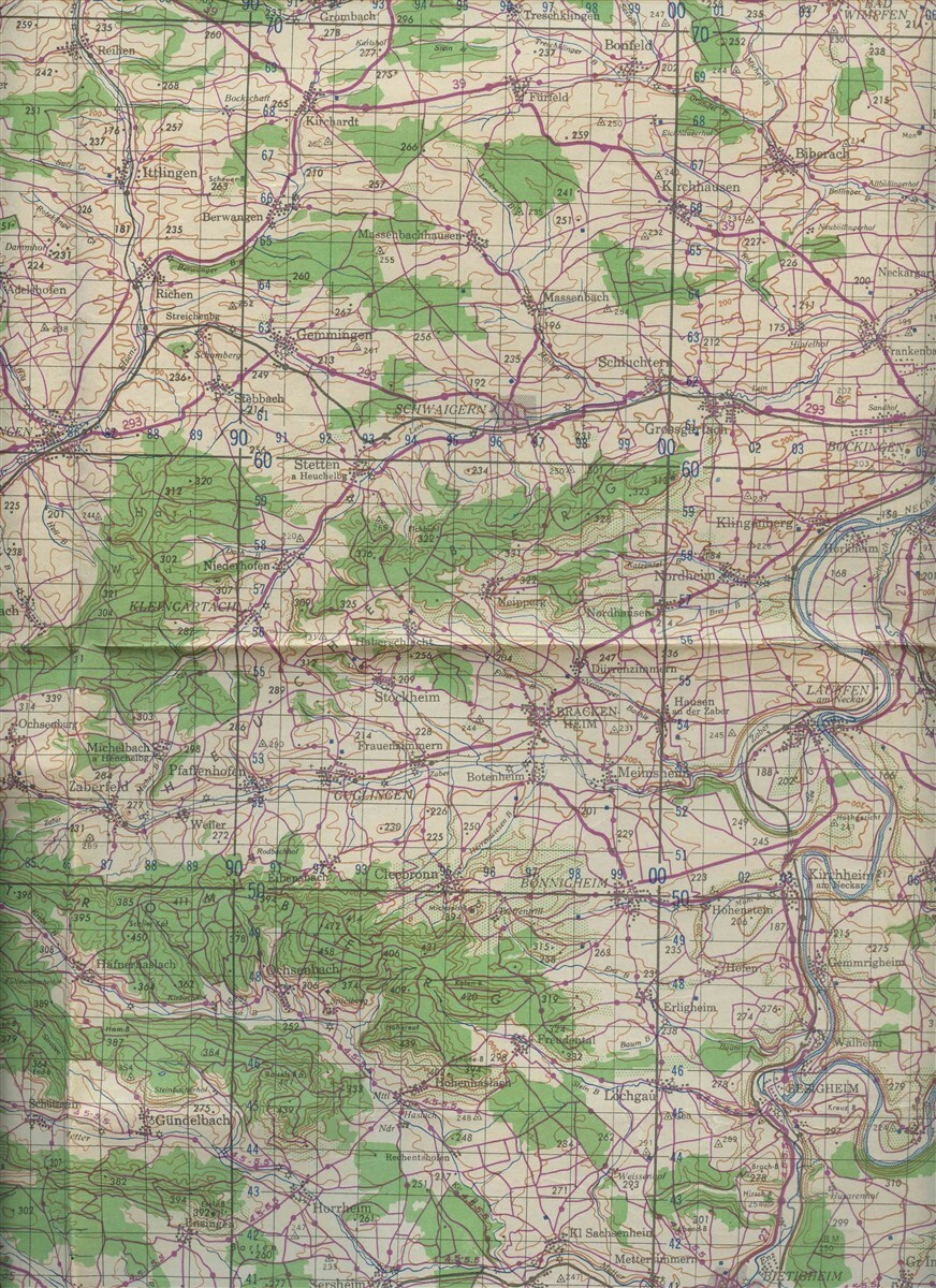 Opens to about 25" x 35" with a blank back. Karlsruhe Germany War Navy Department Restricted Map, dated 1943 . First Edition AMS-2. Sheet V-3. Germany 1:100,000.