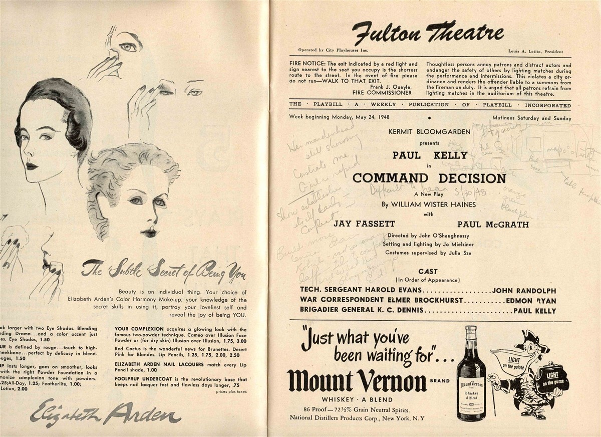 A Playbill for Command Decision at the Fulton Theatre in New York City in 1948. Starring Paul Kelly, Jay Fassett and Paul McGrath