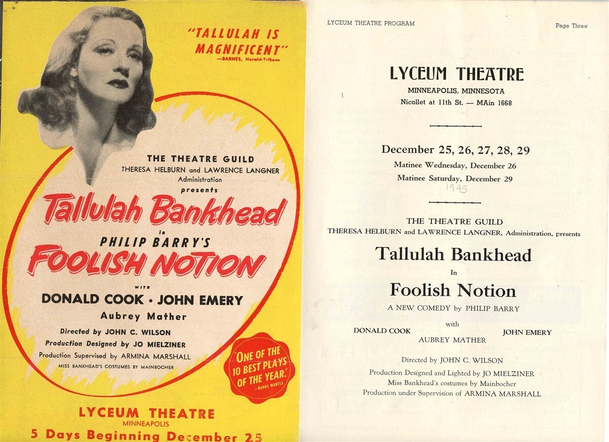Foolish Notion Lyceum Theatre Program & Flyer Minneapolis Tallulah Bankhead 1945