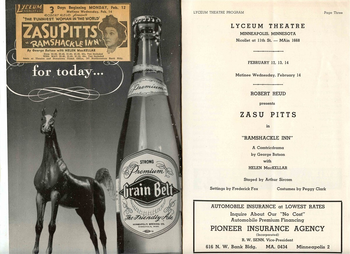 There are 2 items in this lot. Ramshackle Inn Lyceum Theatre Program Flyer, starring Zasu Pitts From Minneapolis MN in 1945. Also has a taped in newspaper clipping