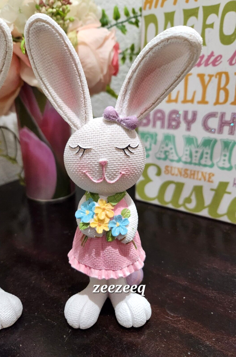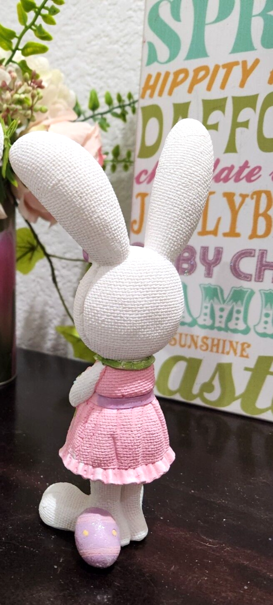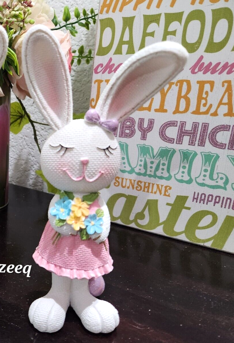Up for sale are this adorable bunny rabbit for your tabletop decor. The girl bunny is sooo cute!! She is wearing a pink dress and holding a boquet of flowers. Made of resin and stand approx 7.5" tall. New