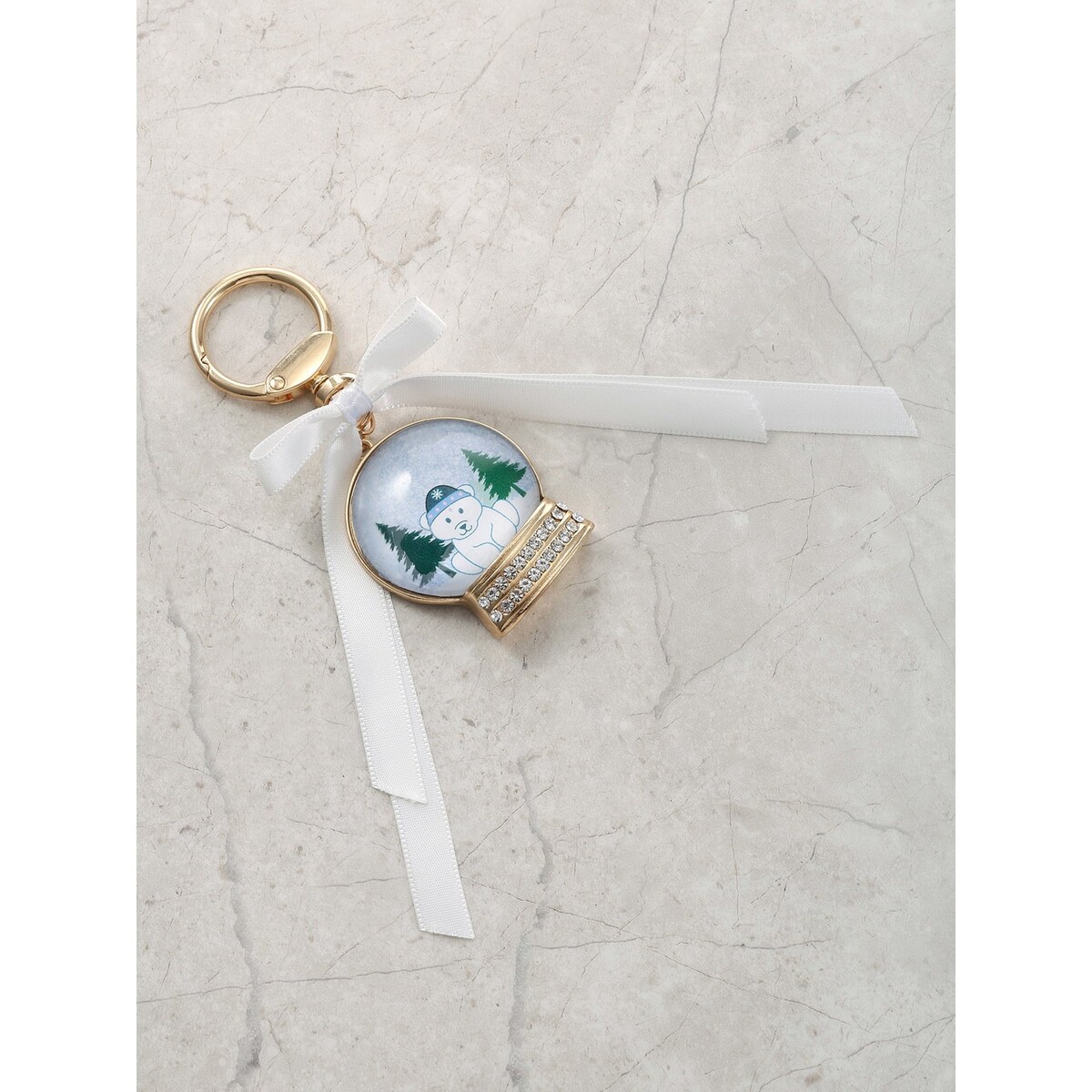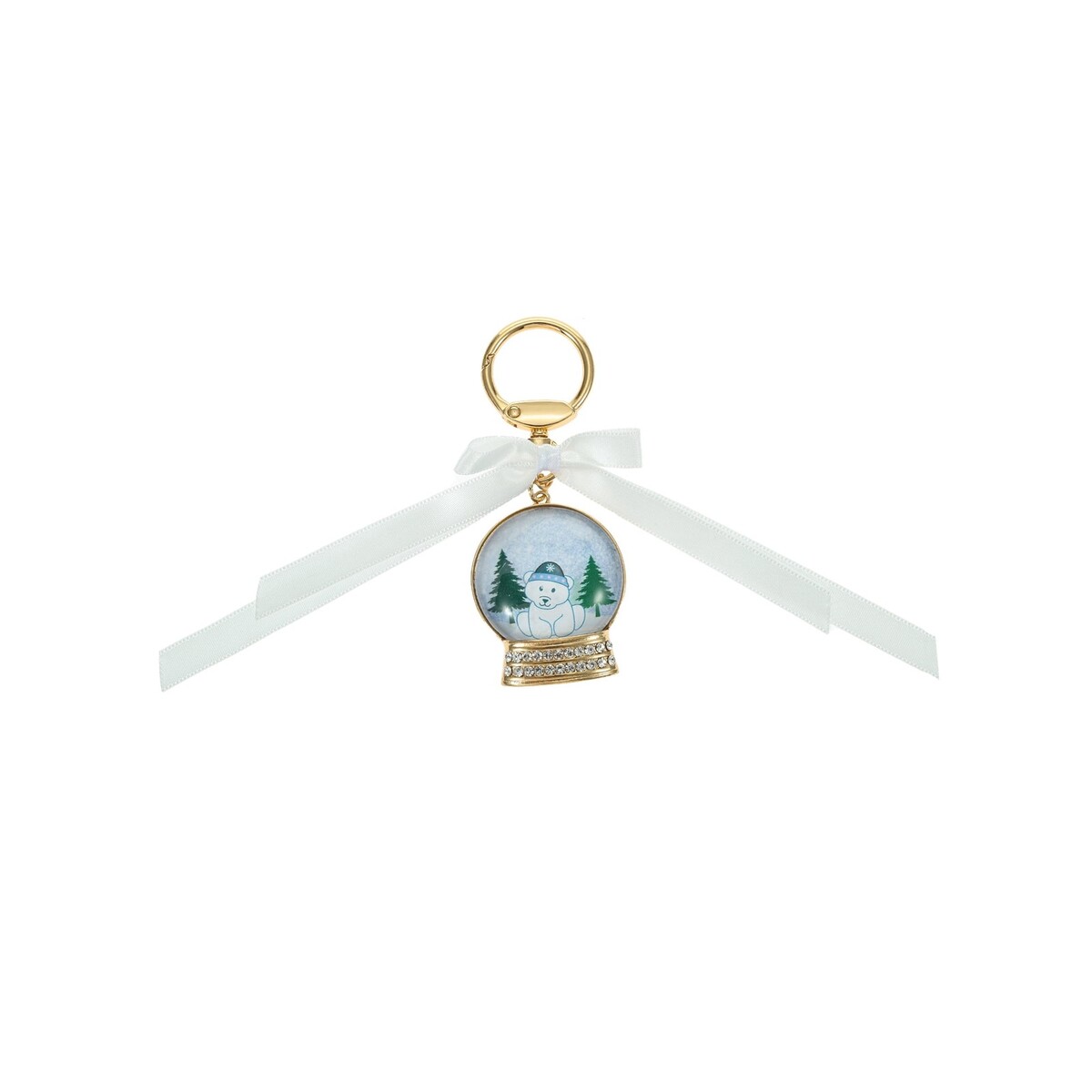Elegant Accents: The snow globe is attached to a gold-tone keyring, and sparkling accents enhance its shimmering appeal at the base of the globe.