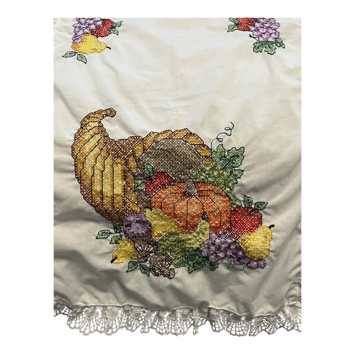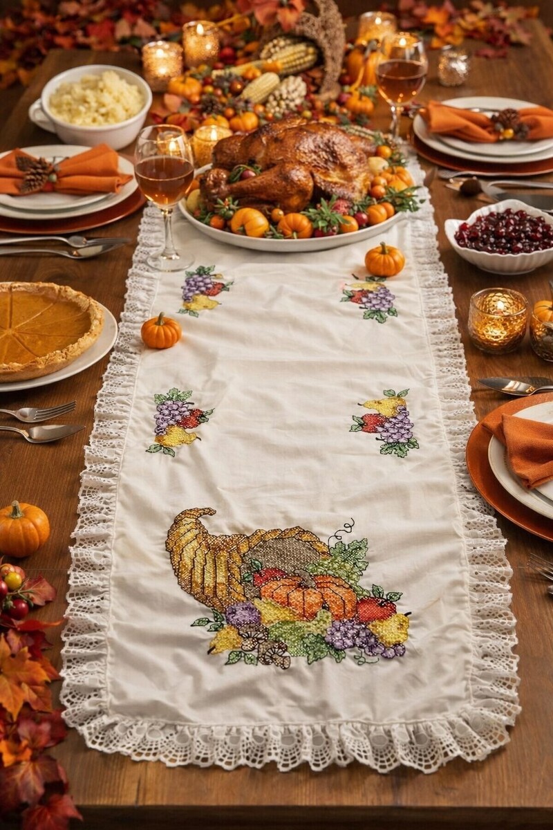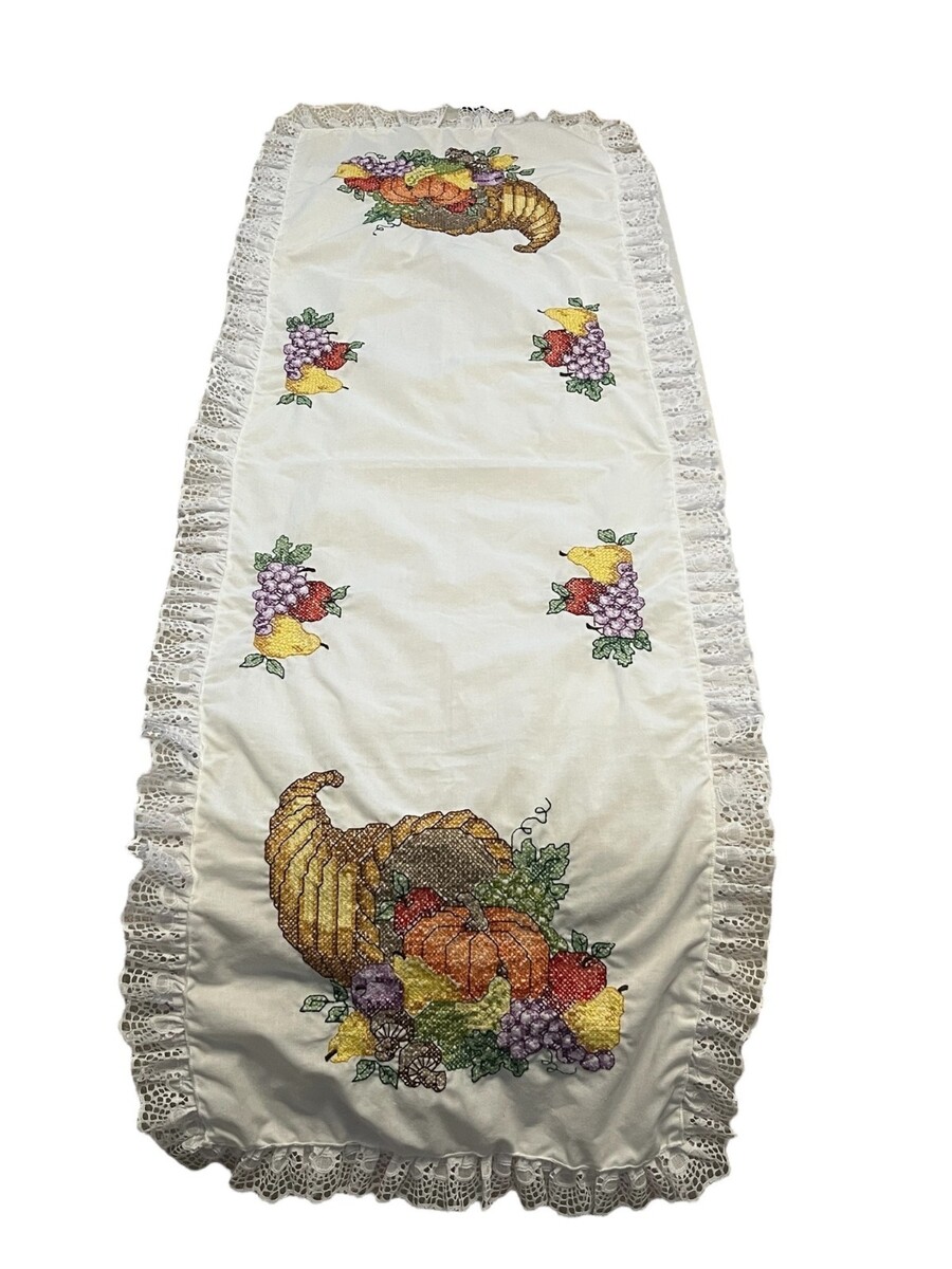 Vintage Thanksgiving Table Runner Cornucopia Lace Trim Harvest Decor